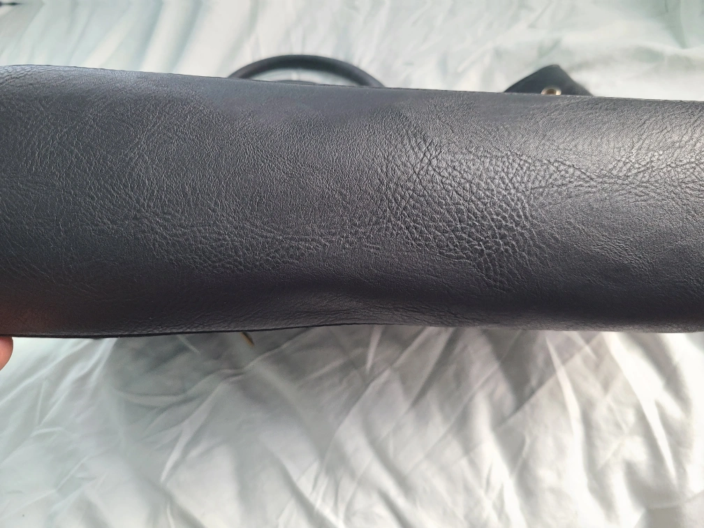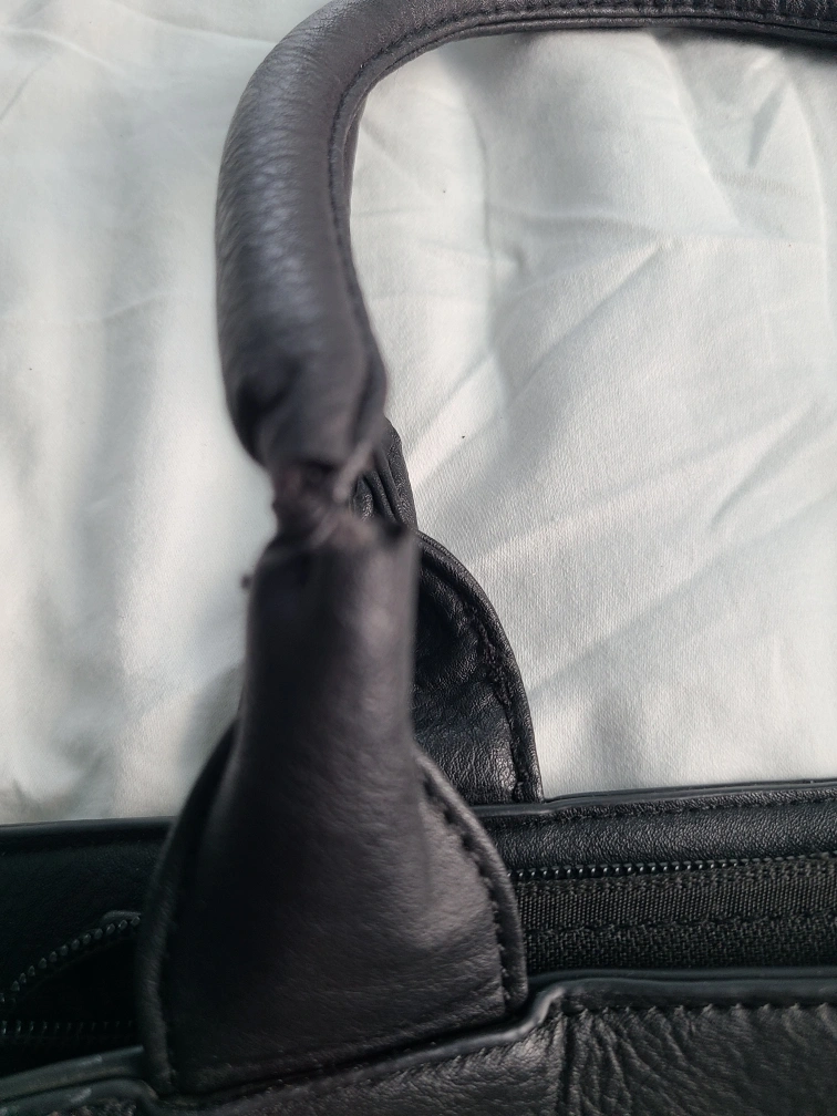 160This is a black tote bag. It features gold studs along the top edge. The bag has a zipper pocket on the back and double handles. The handles show some wear. you can get the handles fix at a shoe maker.