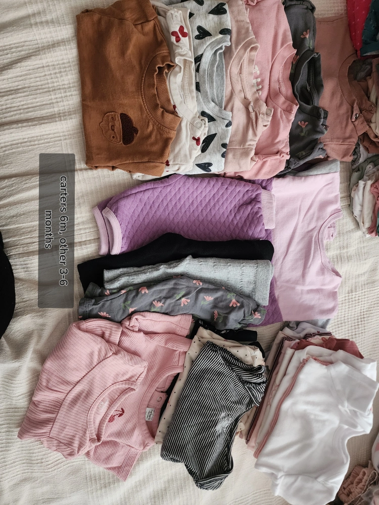 A big bundle of baby clothes! Includes Carters items in sizes 6-9 months, and other brands in sizes 3-6 months. There are also some 0-3 month items included. A great way to stock up on essentials for your little one!