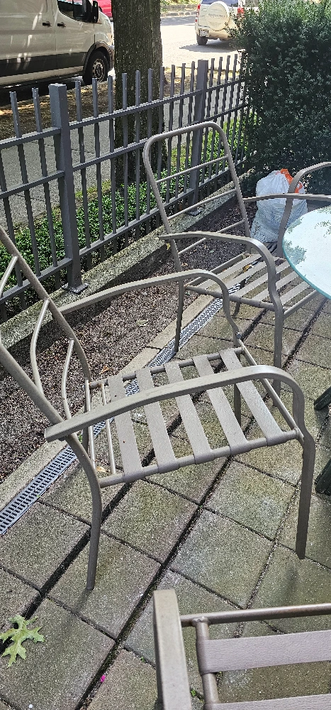 Selling a metal outdoor patio chair. It has a slatted seat and back, perfect for relaxing on your patio or balcony. It's in good condition and ready for a new home
