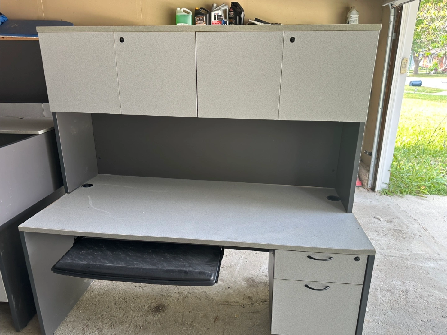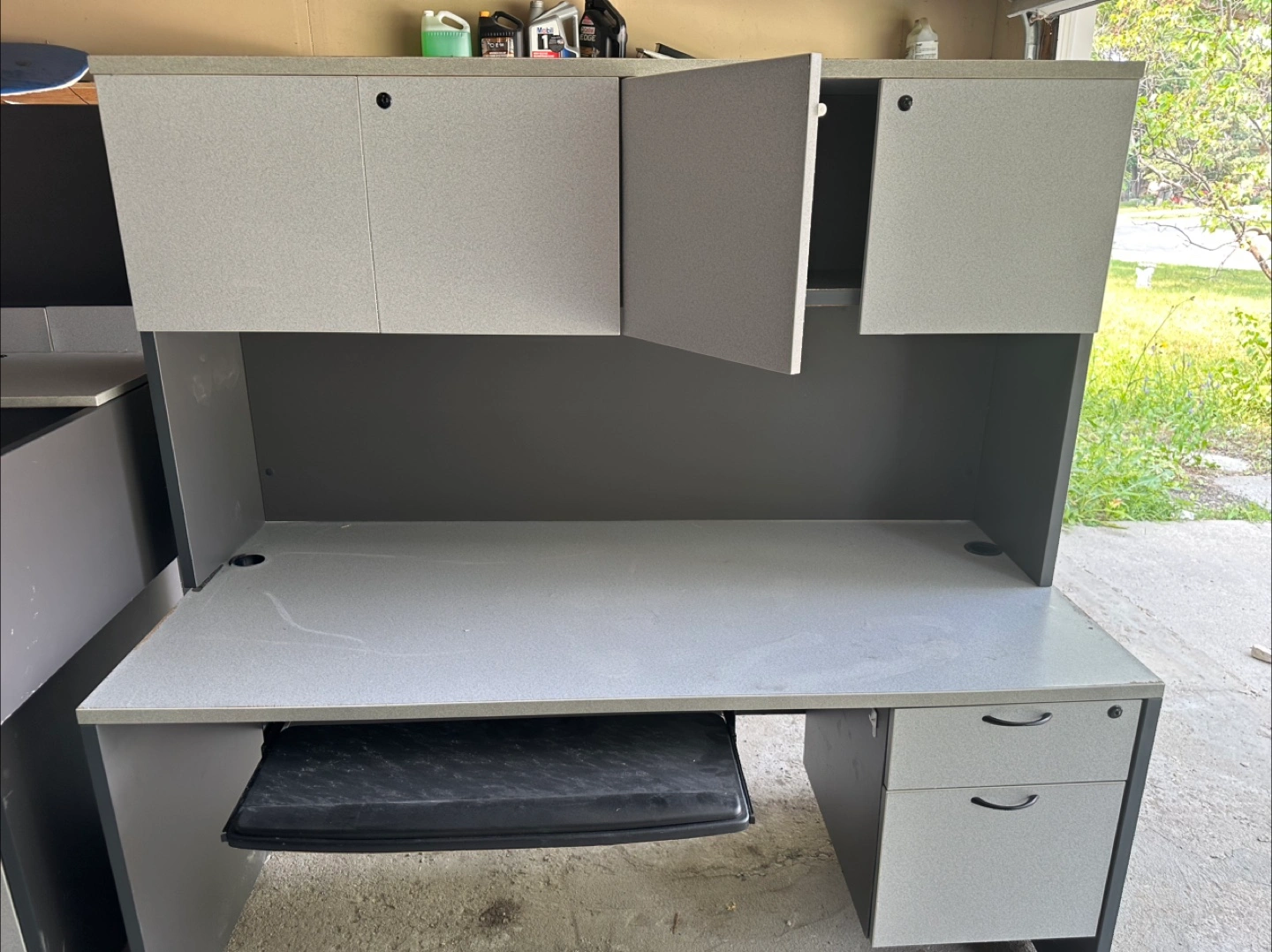 Selling a grey office desk with a hutch. It's in good condition and has plenty of storage space with the overhead cabinets and drawers. Perfect for a home office or study area!