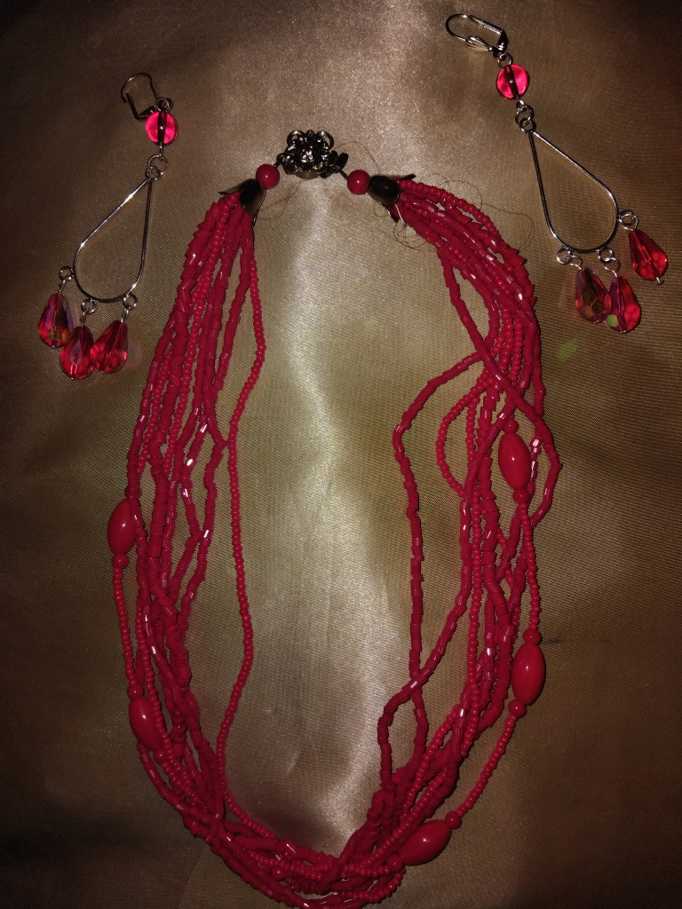 A beautiful red Bohemian Glass necklace and earring set! The necklace has multiple strands of small red beads and larger red beads. The earrings are teardrop shaped with red bead accents. Perfect for adding a pop of colour to any outfit
