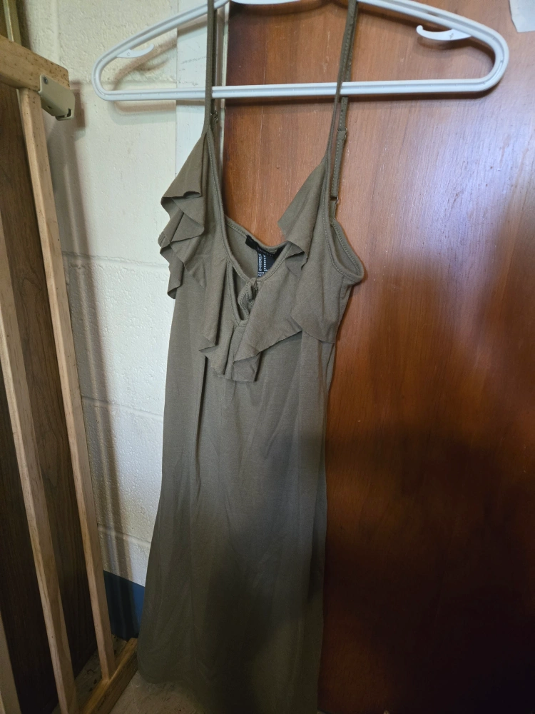 A cute olive green dress from Forever 21! It features a ruffled top and adjustable straps. Perfect for a casual day out or dressing up for an evening event. It's in great condition and ready for a new home!