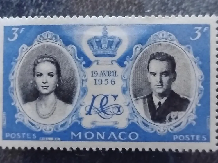 Vintage Monaco postage stamp featuring Grace Kelly and Prince Rainier. The stamp is dated 19 Avril 1956.