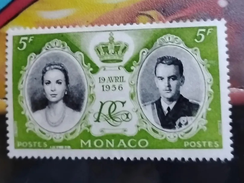 Selling a Monaco postage stamp. The stamp features portraits and the date 19 Avril 1956. It's a 5F stamp.
