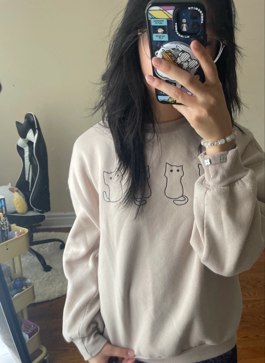 37soft oversized beige crewneck with cute cat print :D (please ignore my shorts in the second photo)