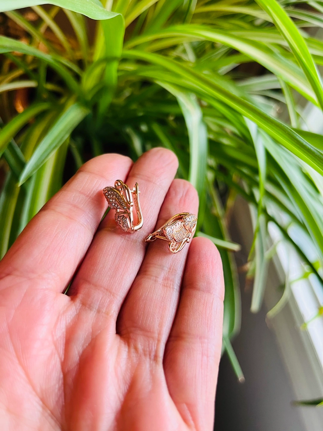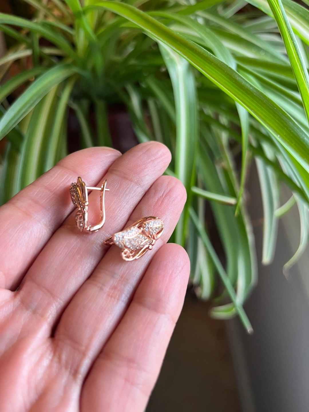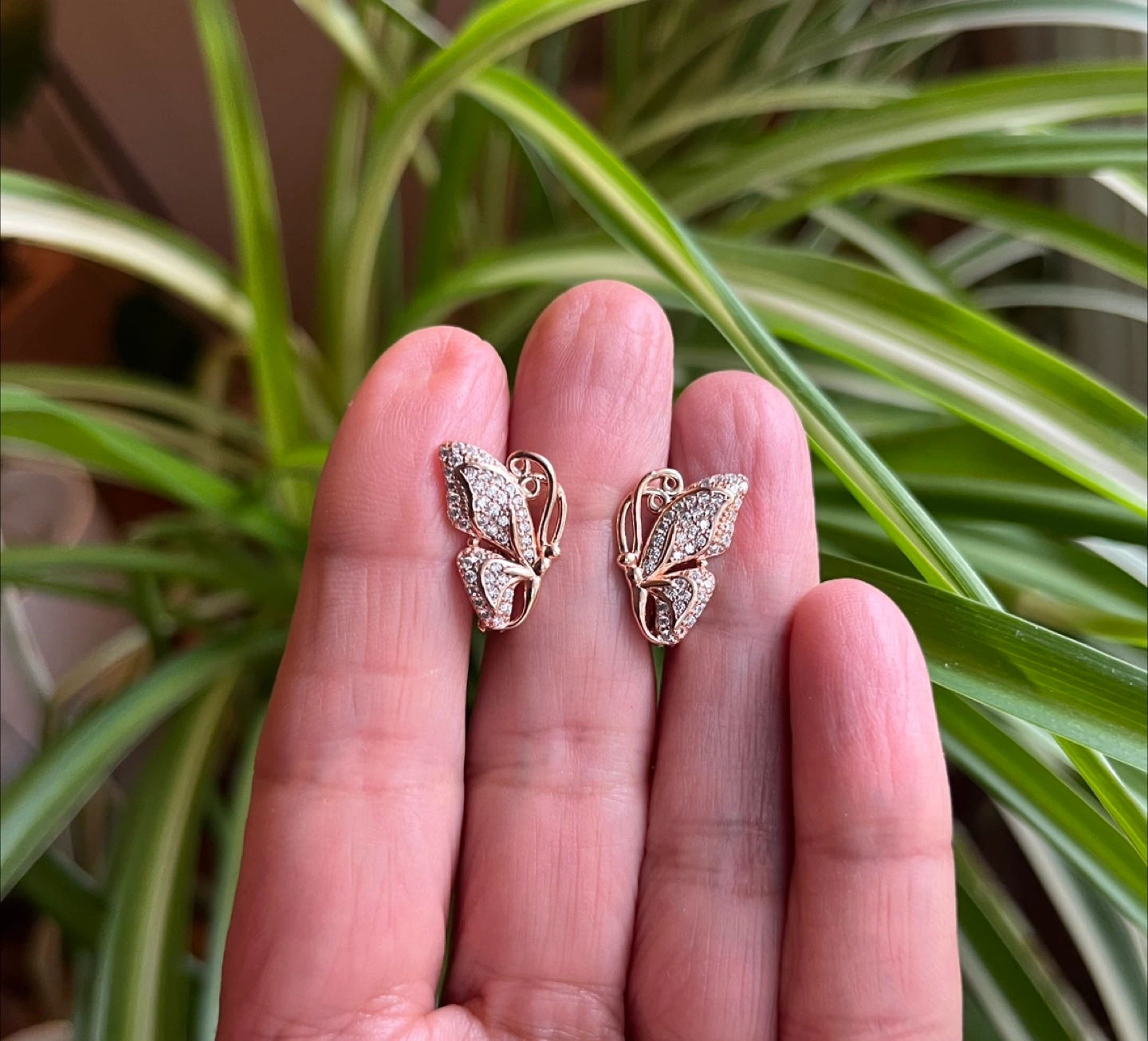 125Selling a pair of butterfly earrings. They have a lovely rose gold colour and are accented with sparkly stones. They're brand new and gold plated . Approximately 2 cm tall