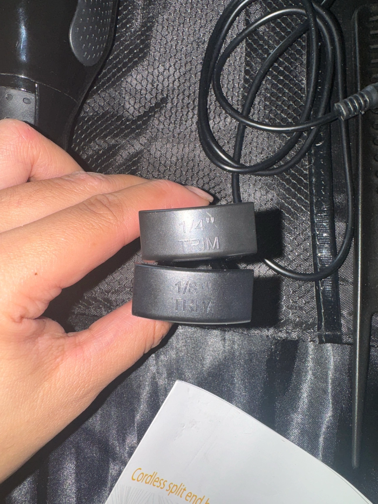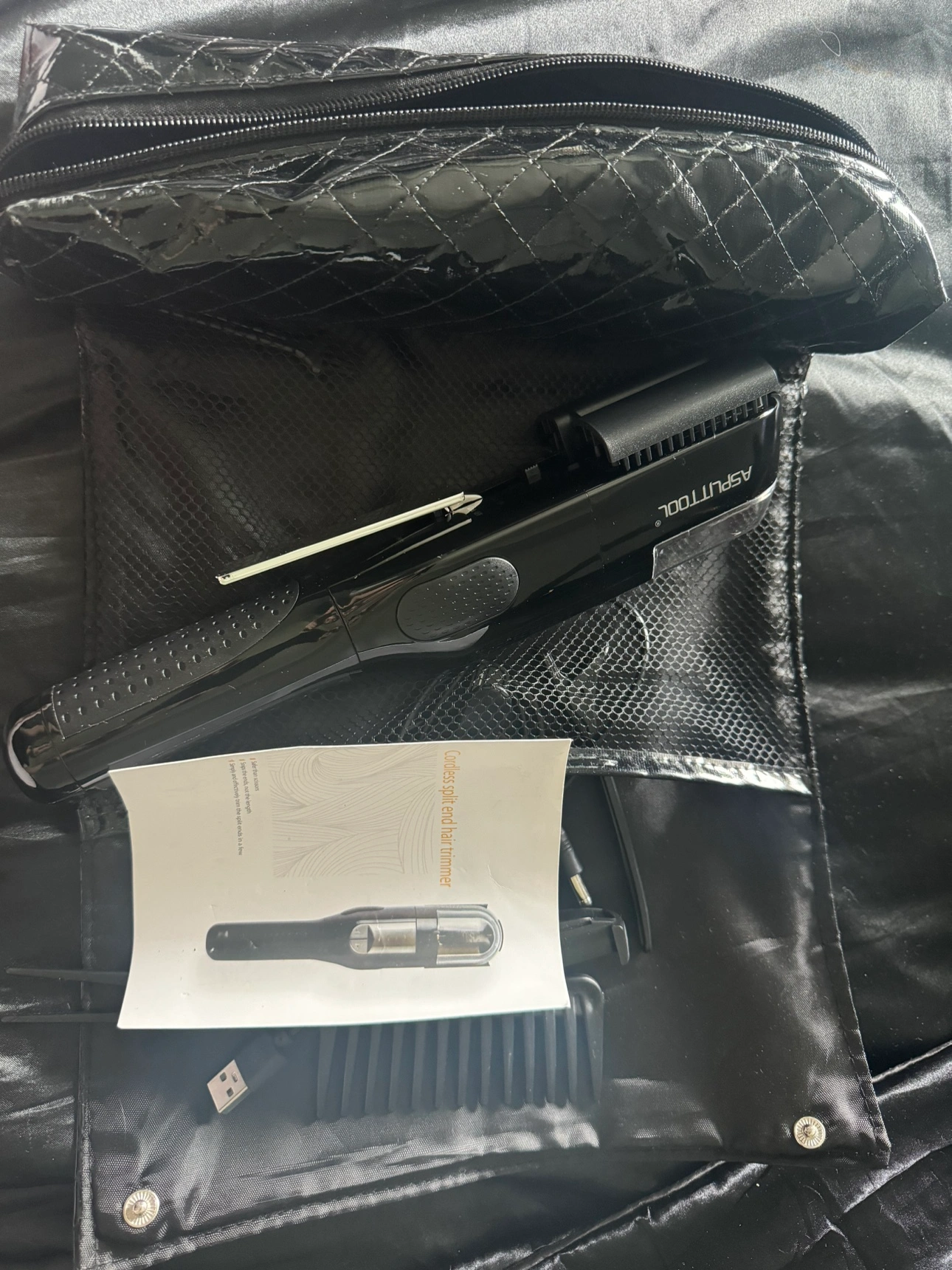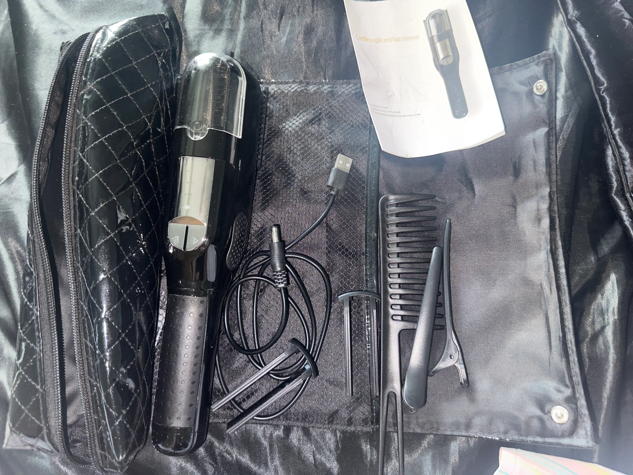 Cordless split end hair trimmer that snips the ends not the length. Quality still great, used only twice. No longer needed. Everything included; Charger wire, instructions, 2 clips, 1 comb with section end, two different trim lengths 1/4-1/8, carrying case and cleaning brush.