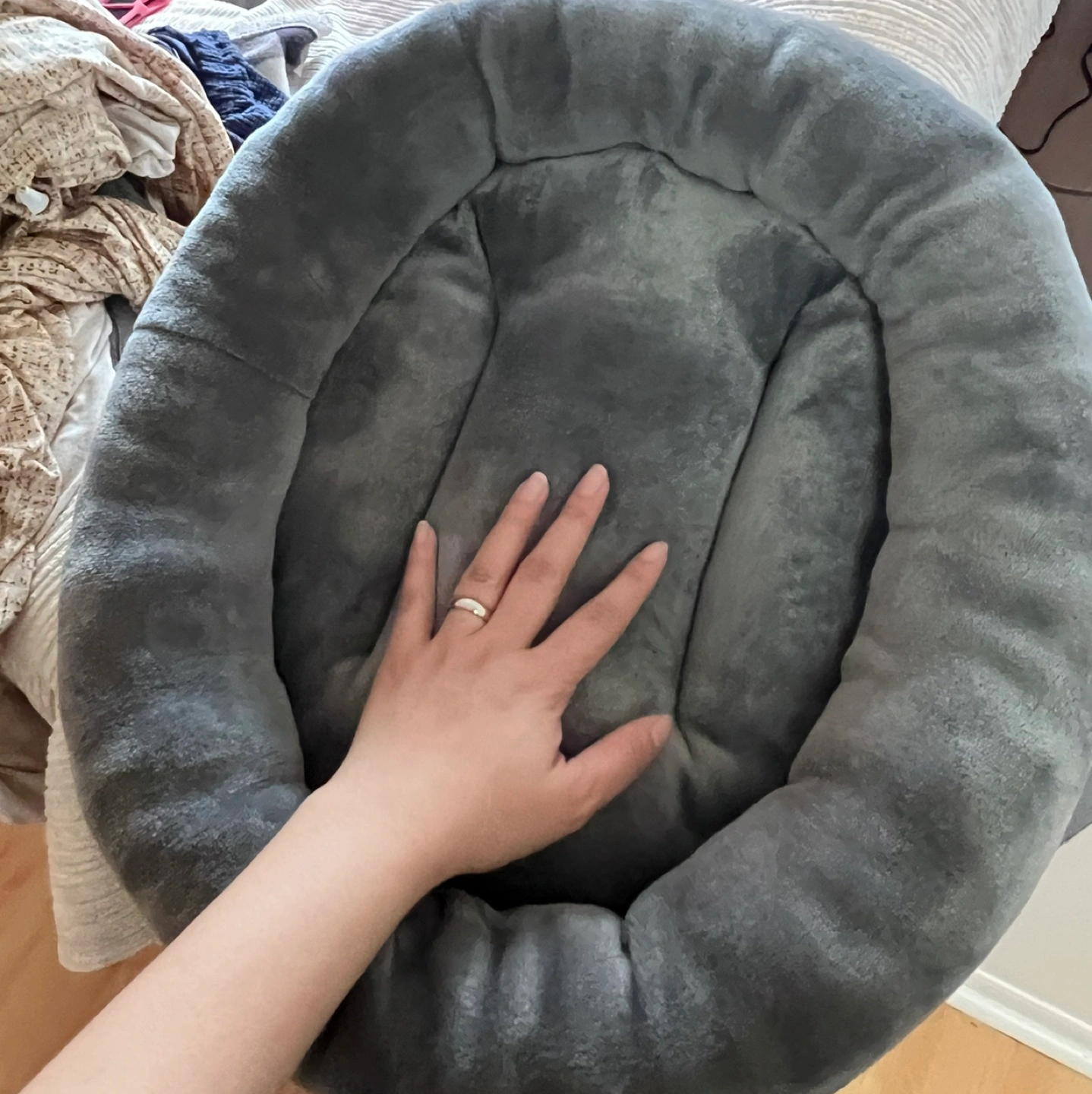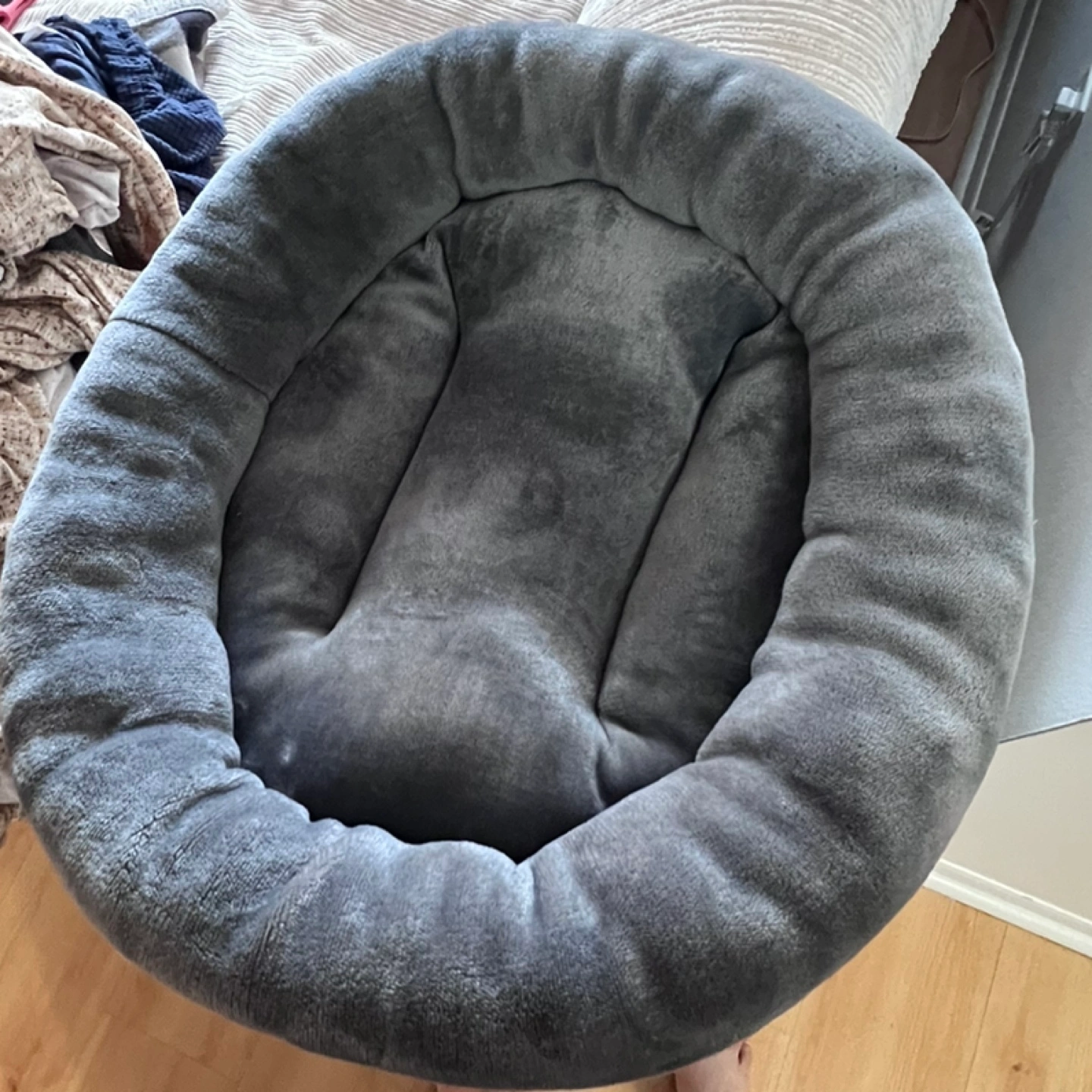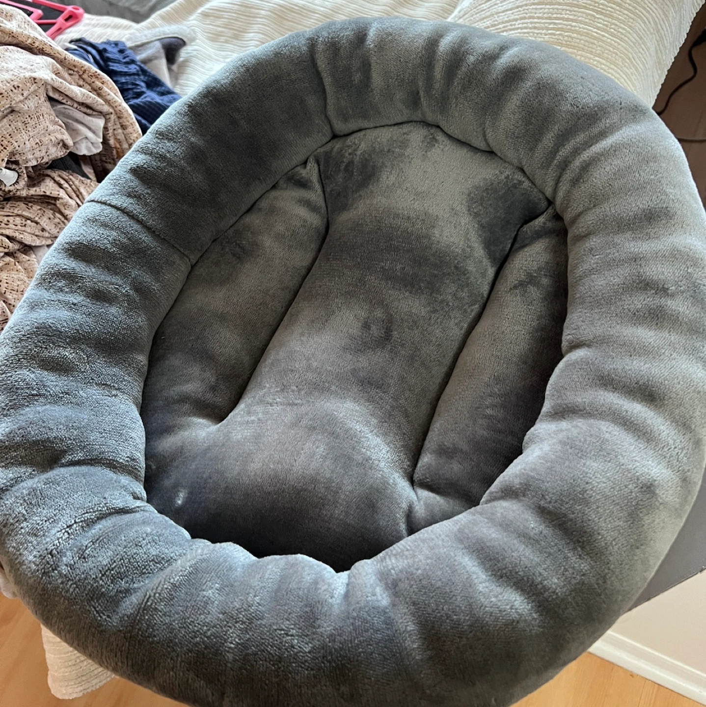 Small grey pet bed. Soft material. Oval shape. Machine washable.