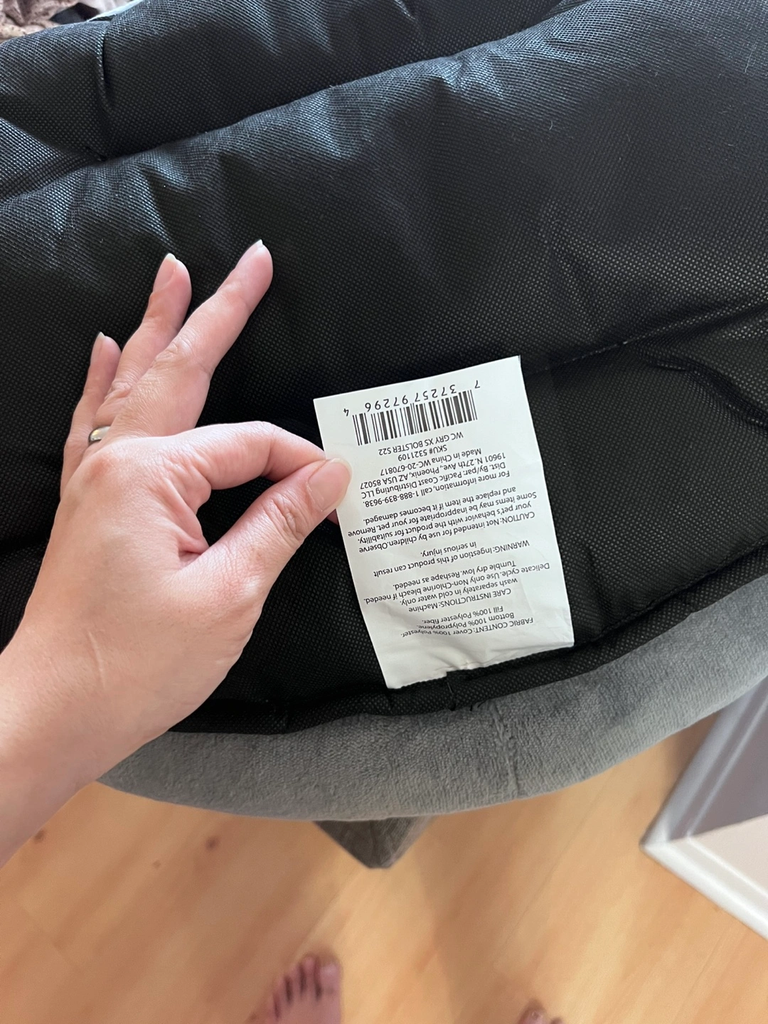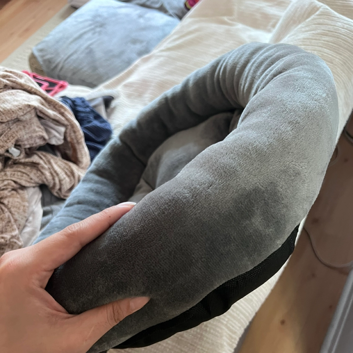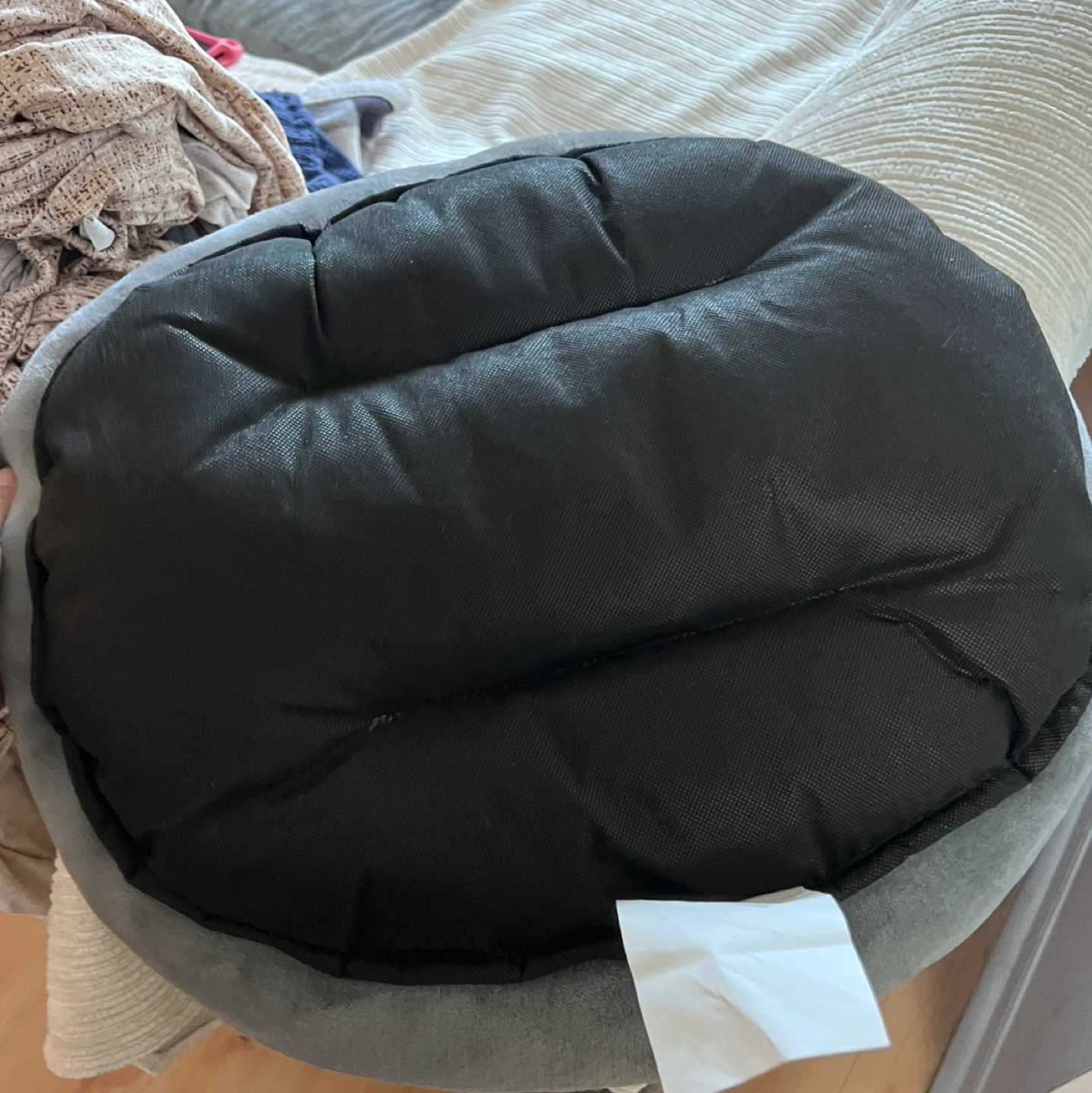 Small grey pet bed. Soft material. Oval shape. Machine washable.