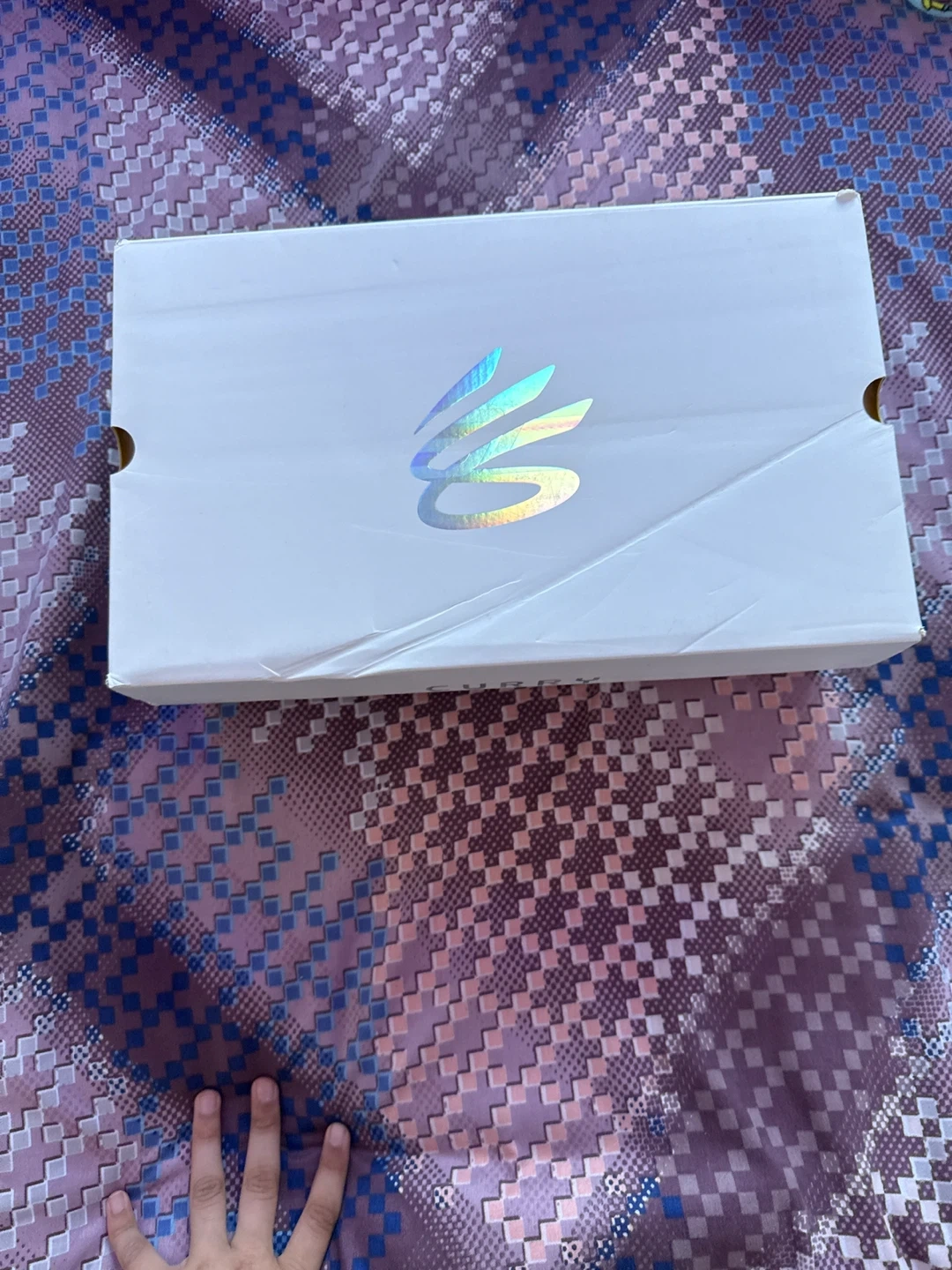 These are Curry brand athletic shoes. They're white with yellow and blue accents. Comes in original box.