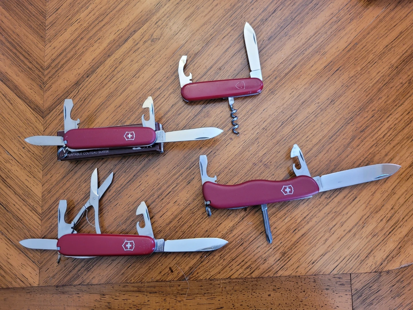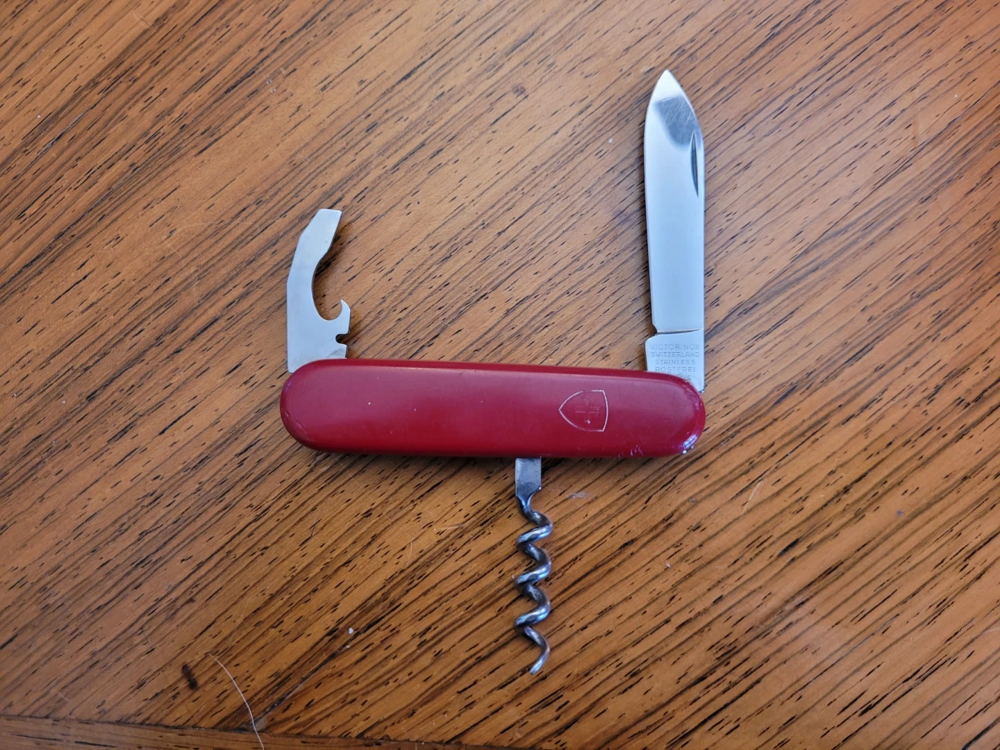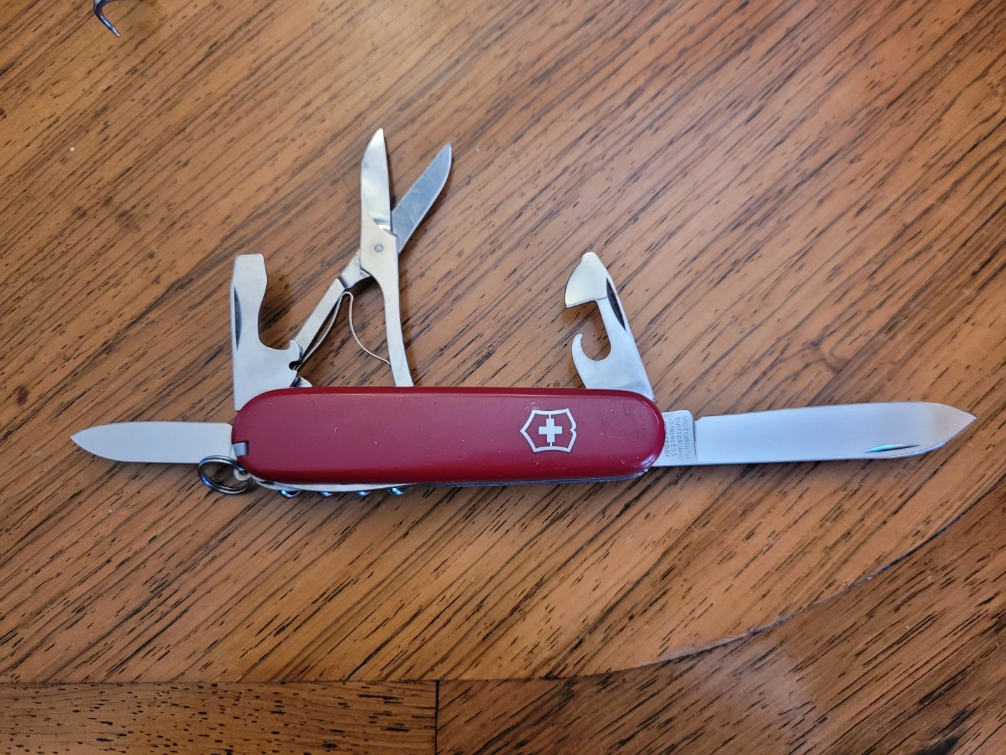 Red multi-tool pocket knife with various functions. Includes a large blade, can opener, bottle opener, screwdriver, and scissors. Compact and durable design for everyday use.