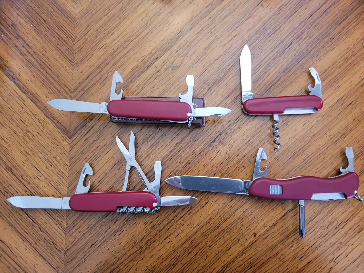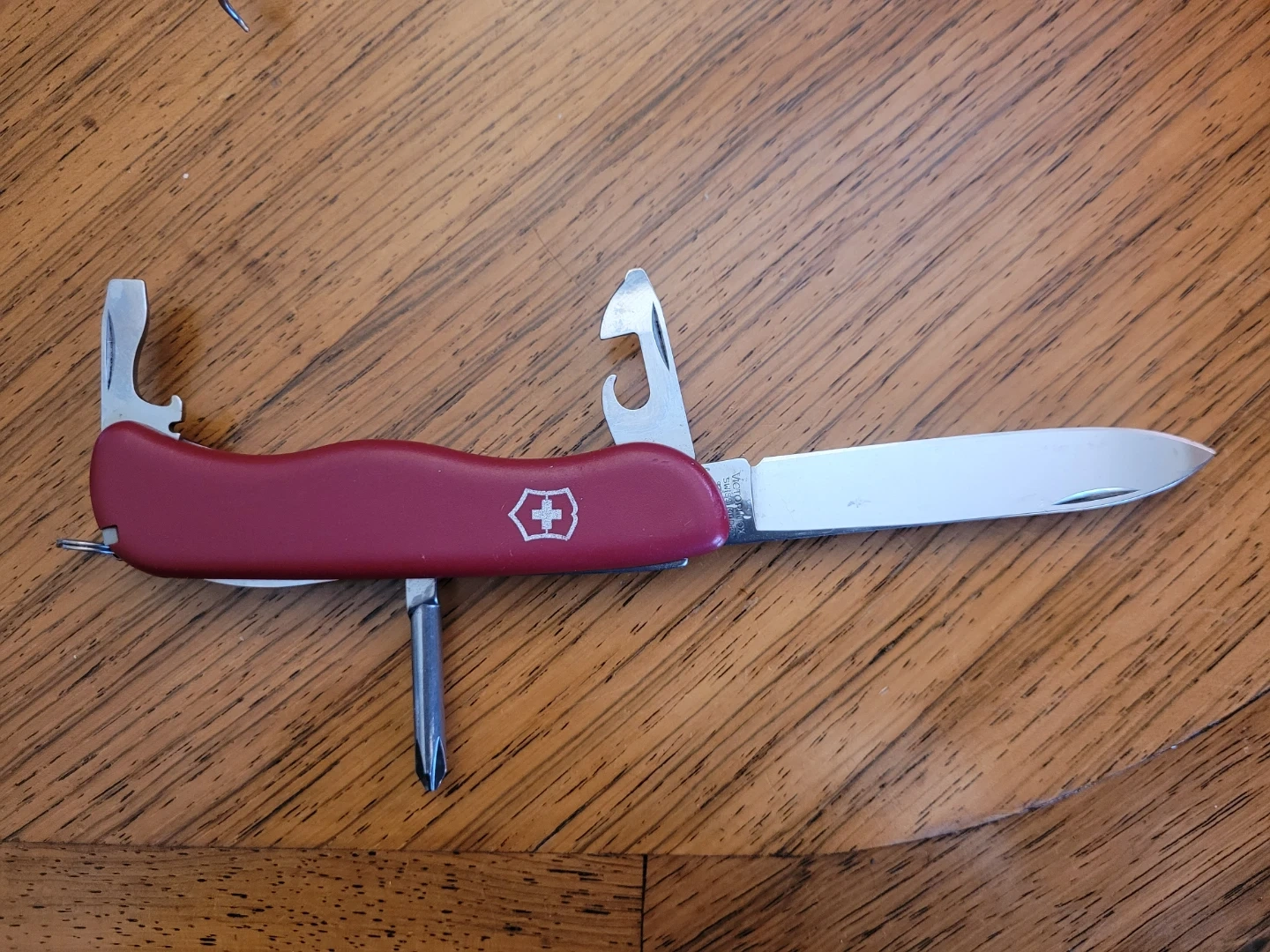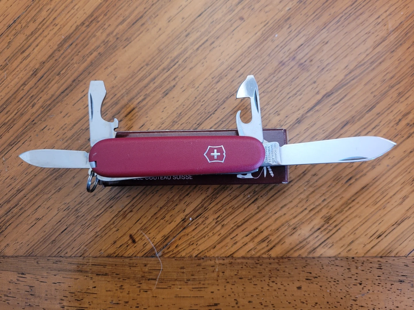 Red multi-tool pocket knife with various functions. Includes a large blade, can opener, bottle opener, screwdriver, and scissors. Compact and durable design for everyday use.