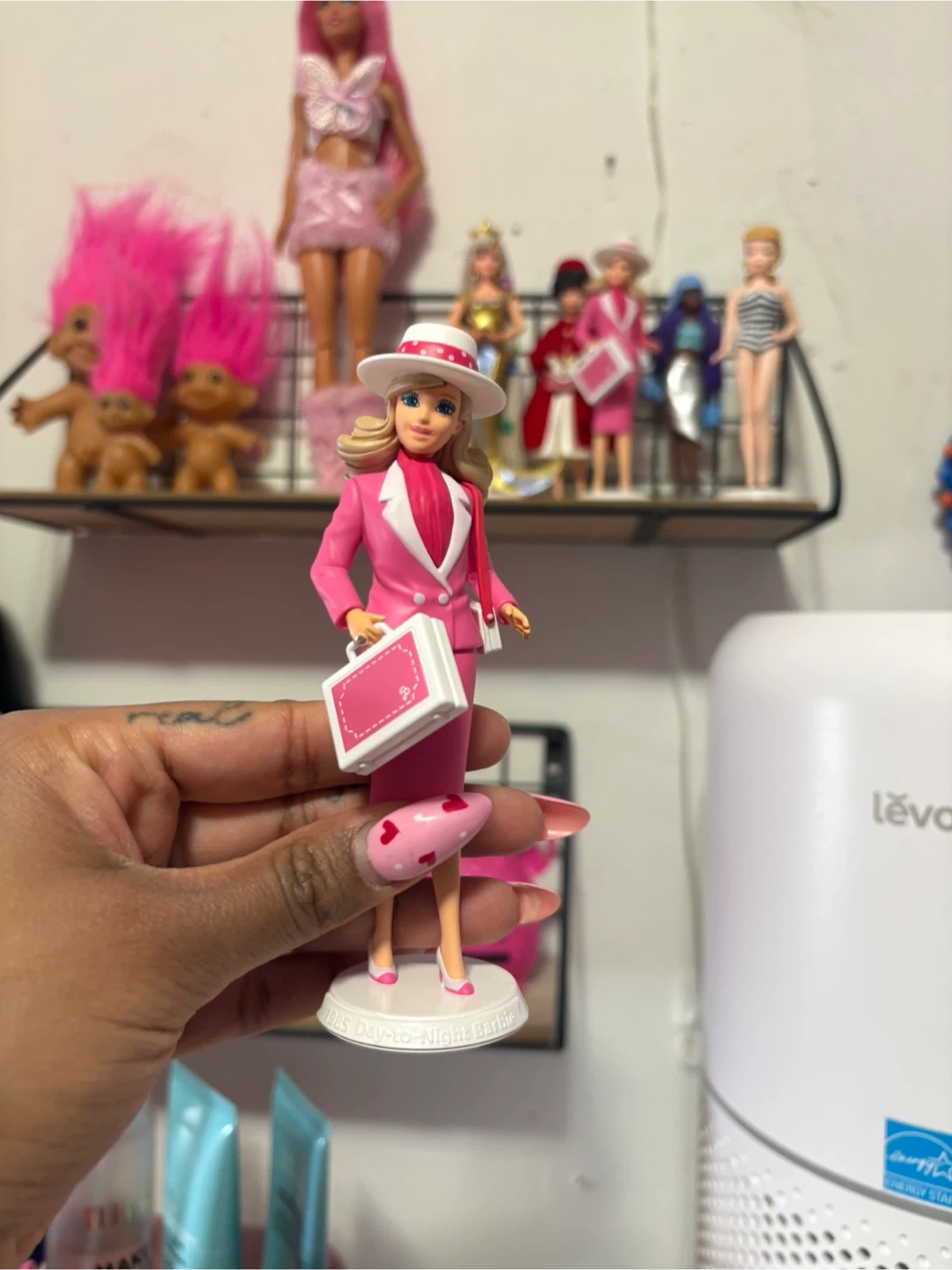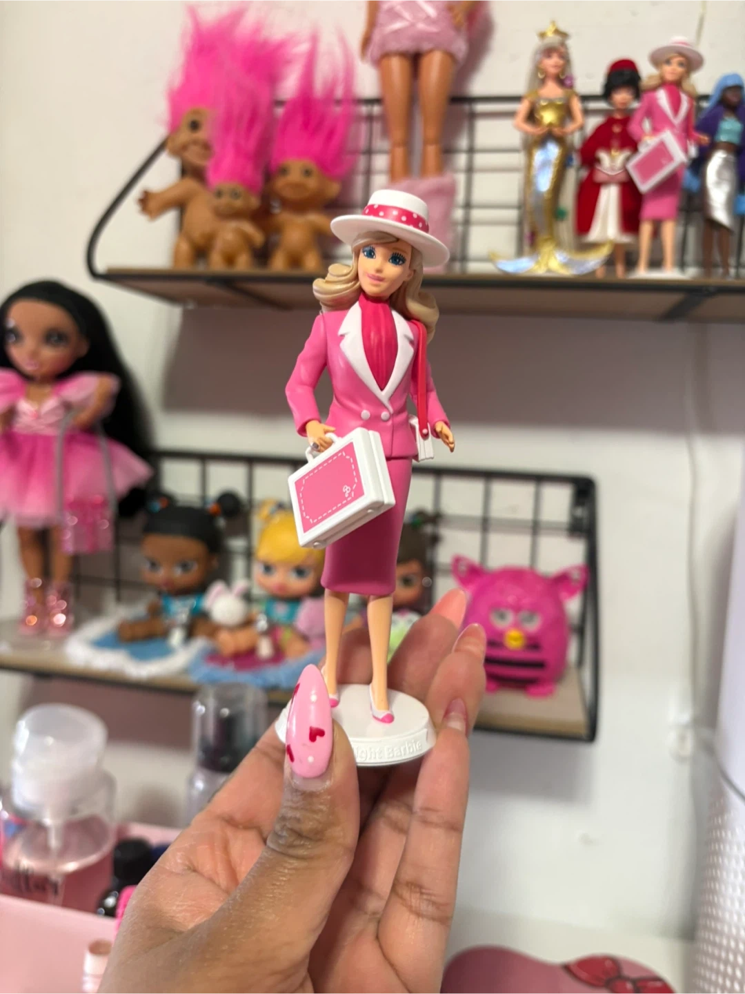 This is a Barbie doll dressed in a stylish pink business suit with a matching hat and briefcase. It's a classic collector's item or a fun toy for playtime. The doll stands on a white display base.