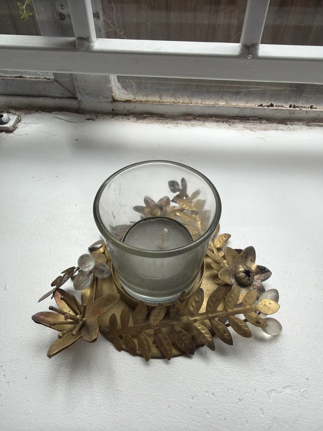 A lovely glass candle holder from the Cross with a decorative gold-toned metal base featuring leaf and floral accents. Includes a tea light candle. Adds a touch of elegance to any space!