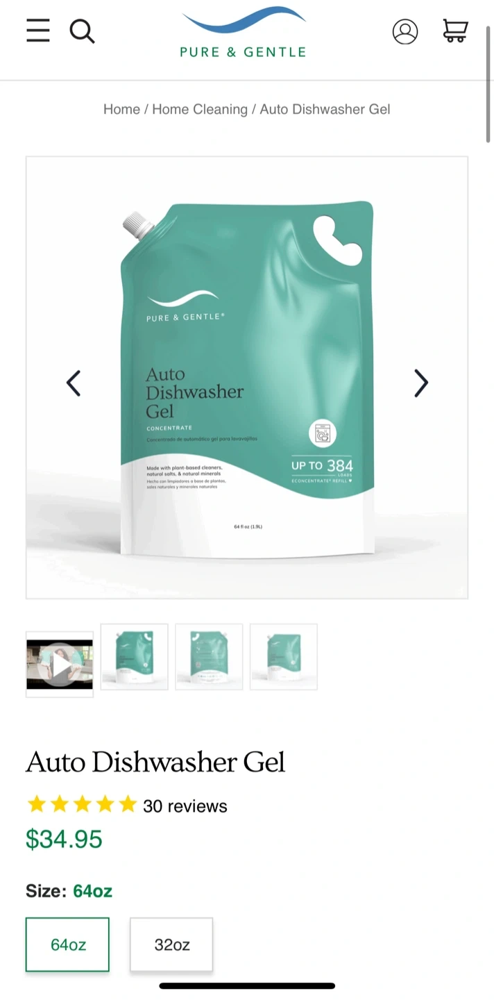 This is a 64oz refill pouch of Pure & Gentle Auto Dishwasher Gel Concentrate. It's made with plant-based cleaners, natural salts, and natural minerals. Up to 384 uses per pouch!