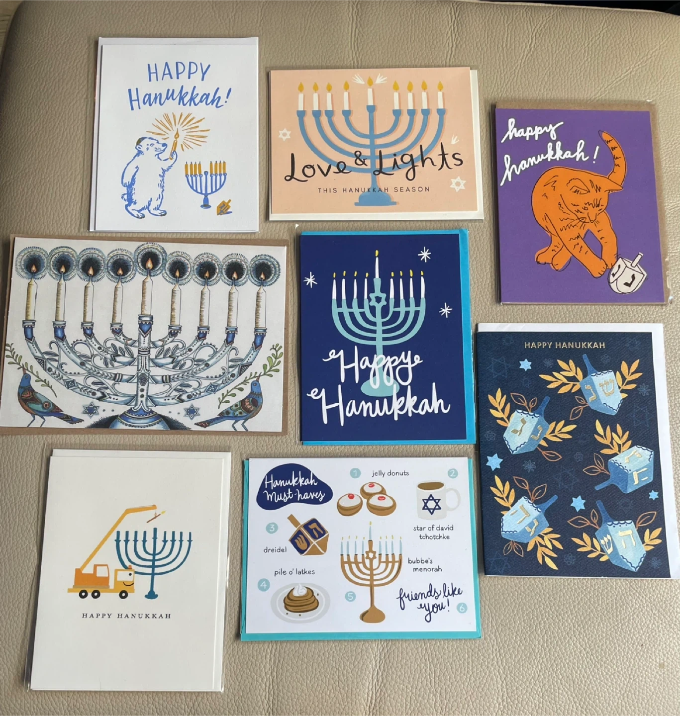 A collection of 8 festive Hanukkah greeting cards. Designs include menorahs, dreidels, and seasonal greetings. Includes cards with cute animal illustrations and food themes. Perfect for sending holiday wishes this Hanukkah season!