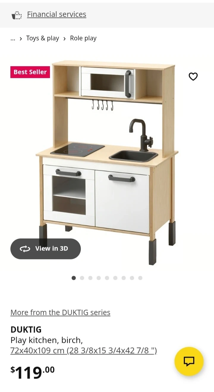 This is a DUFTIG play kitchen in birch. It features a sink, stovetop, and microwave with shelves. It's great for imaginative play for little chefs!