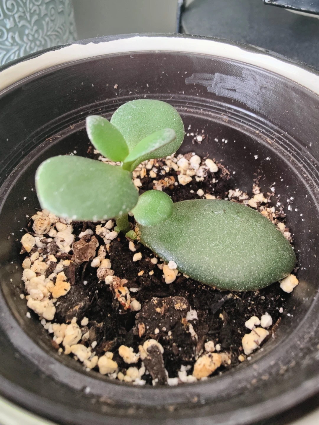 A small jade plant with green leaves. Planted in soil with perlite. Ready for a new home!