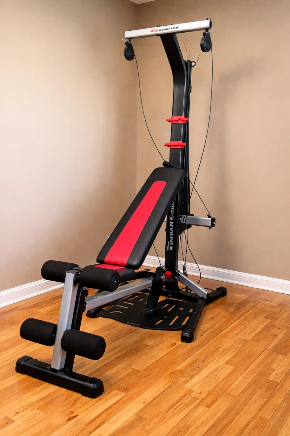 Bowflex PR3000 home gym with multiple cable pulley stations. It's black and red with silver accents. Includes adjustable bench and leg attachment.
