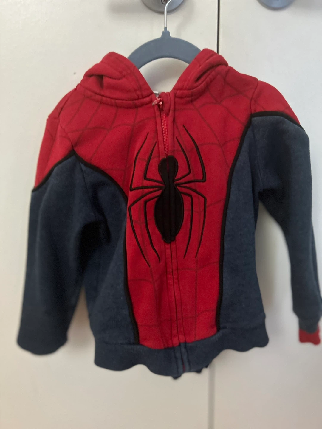 Spiderman outfit set with a hoodie and pants! The hoodie is red and black with a Spiderman design on the front, and the pants are black with a Spiderman logo on the side