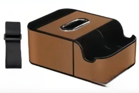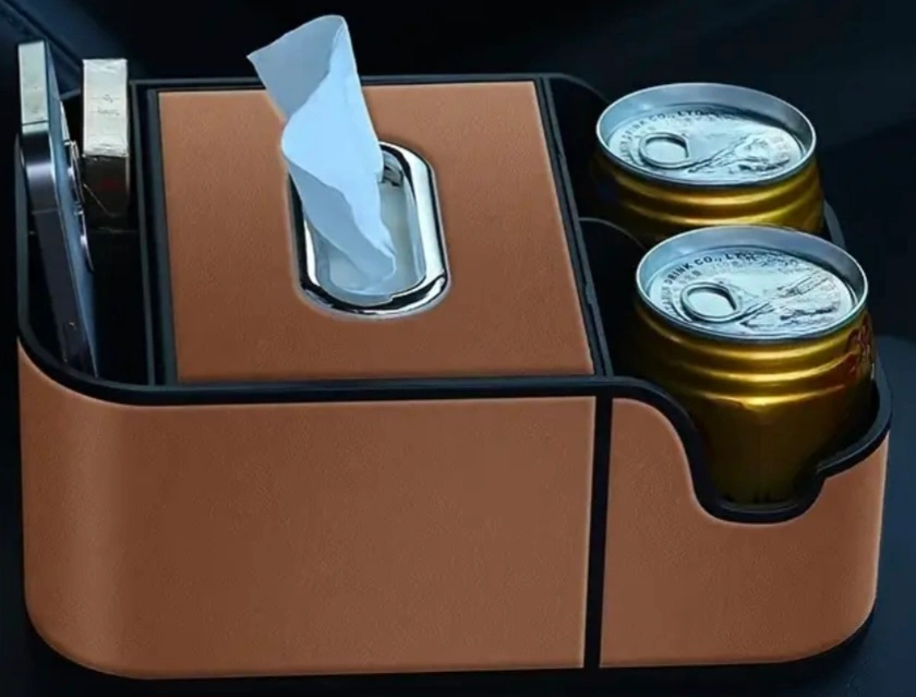 A car console organizer. Rectangular shape with an opening in the centre. Features a tissue box holder. Can also hold phones and drinks. A very useful item to keep your car organized.