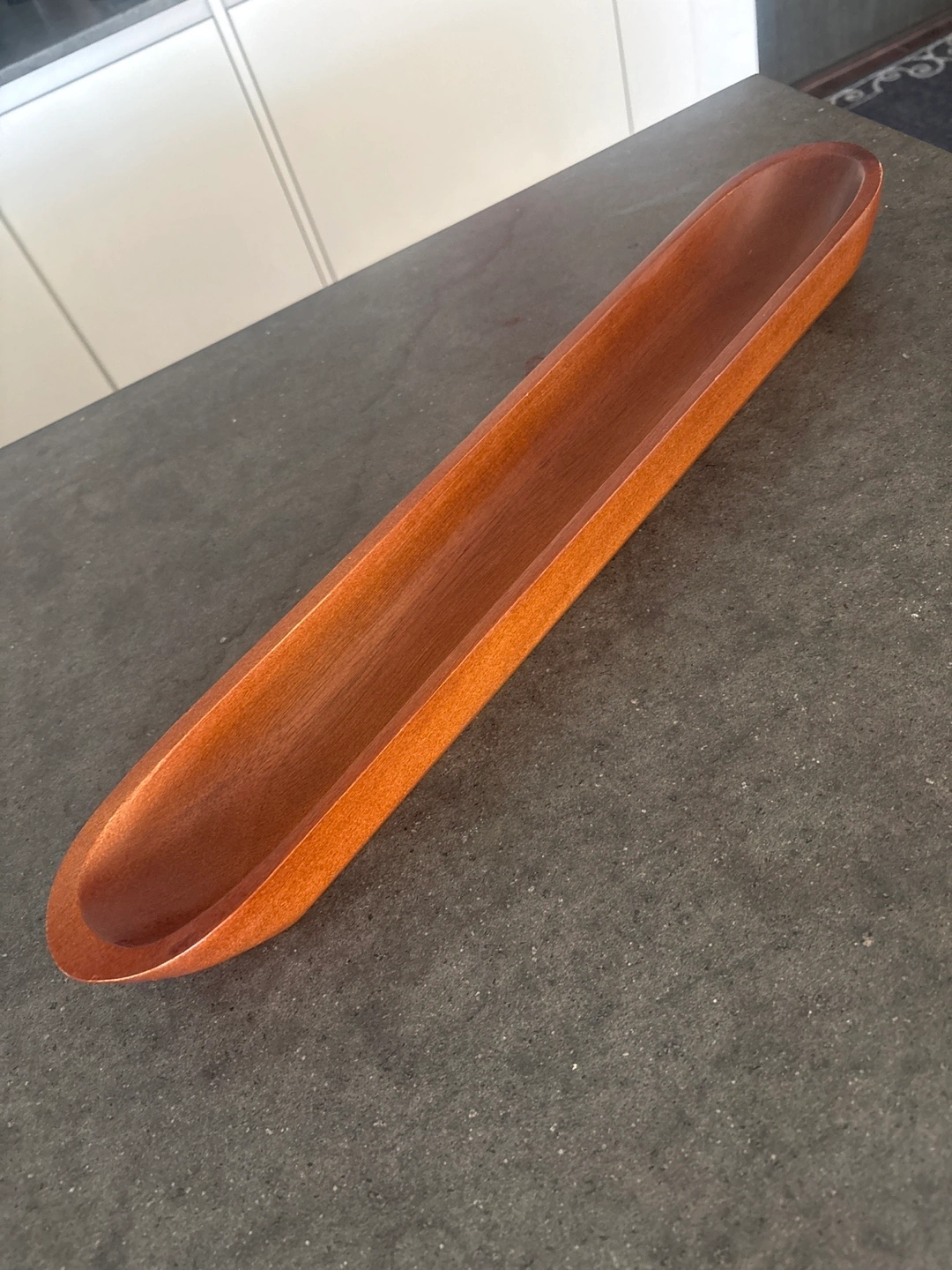 Long, narrow wooden boat. Perfect for serving bread or other items. Smooth, polished finish. Subtle reddish-brown colour.