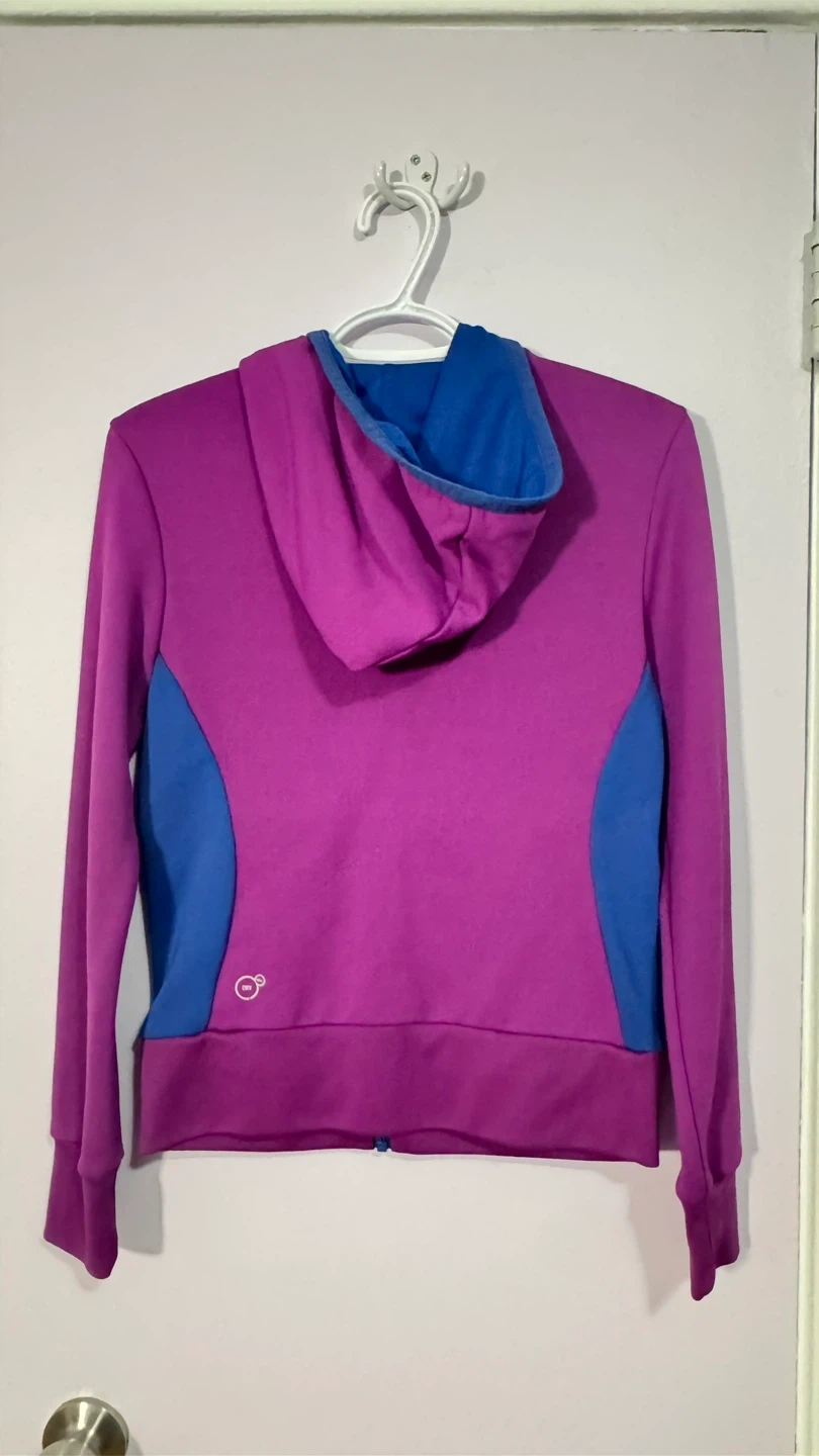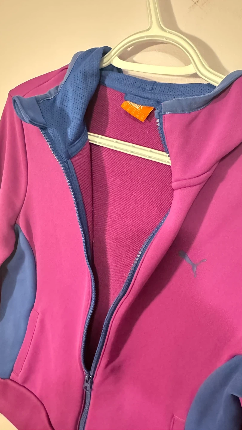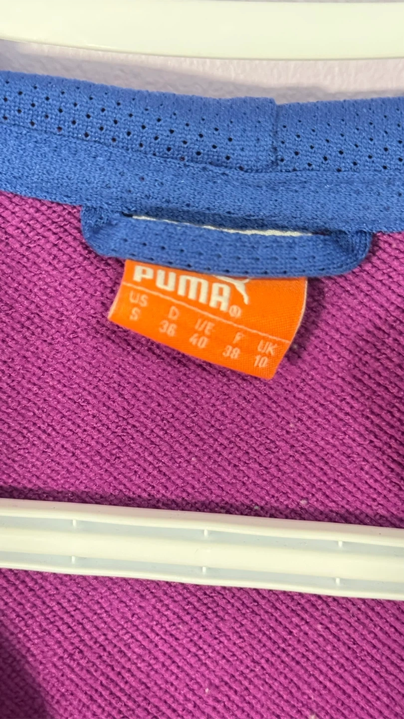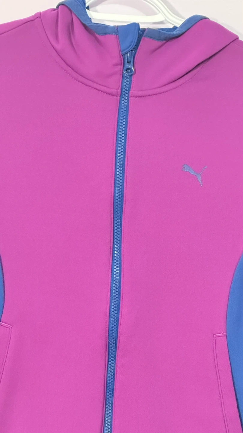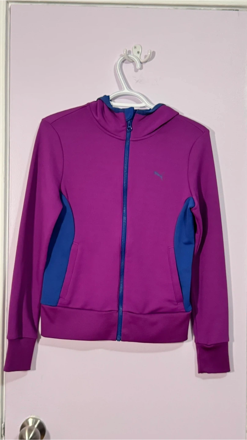 This Puma zip-up hoodie is a stylish blend of purple and blue. It's made of a comfortable fabric and features a full zipper closure. The hood is lined with blue mesh.