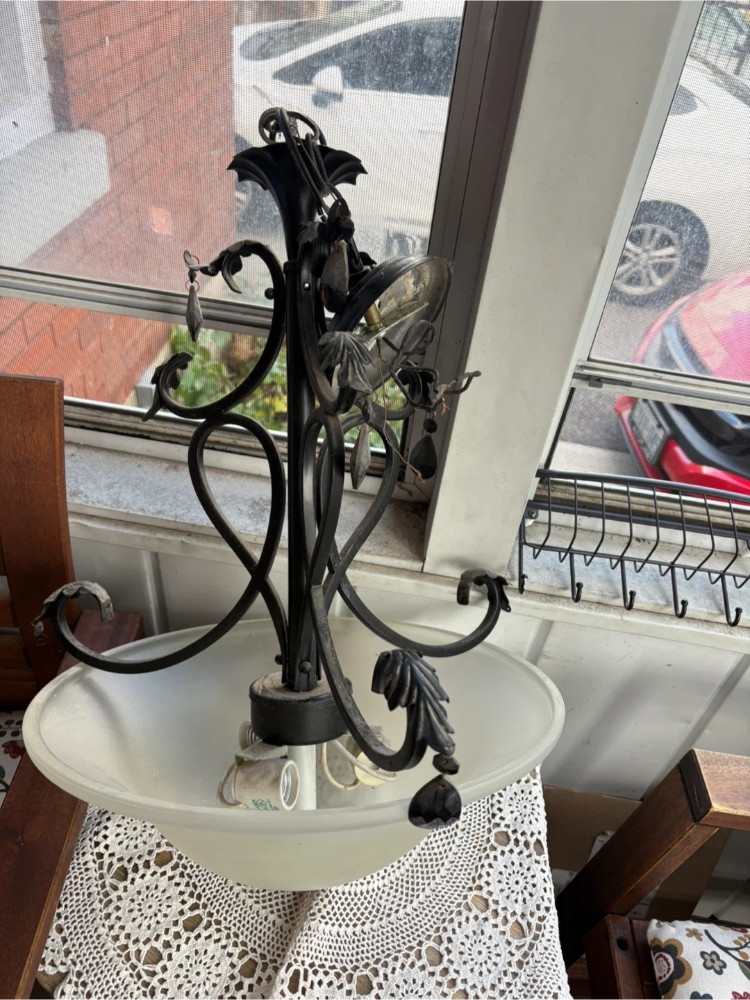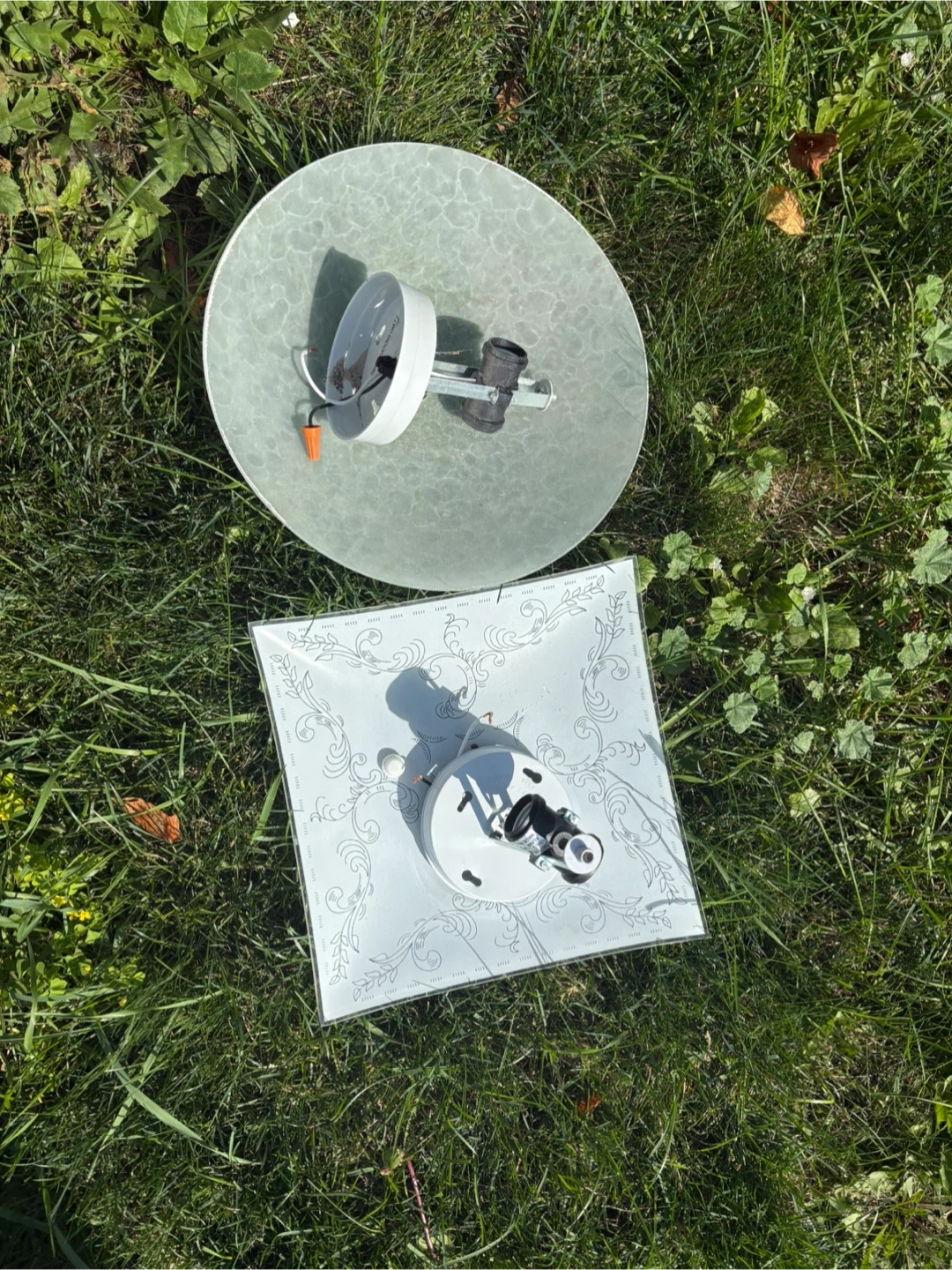 Selling a couple of ceiling light fixtures. They're used but still in good condition. One is round and the other is square with a floral pattern. Also have a wrought iron chandelier style fixture.