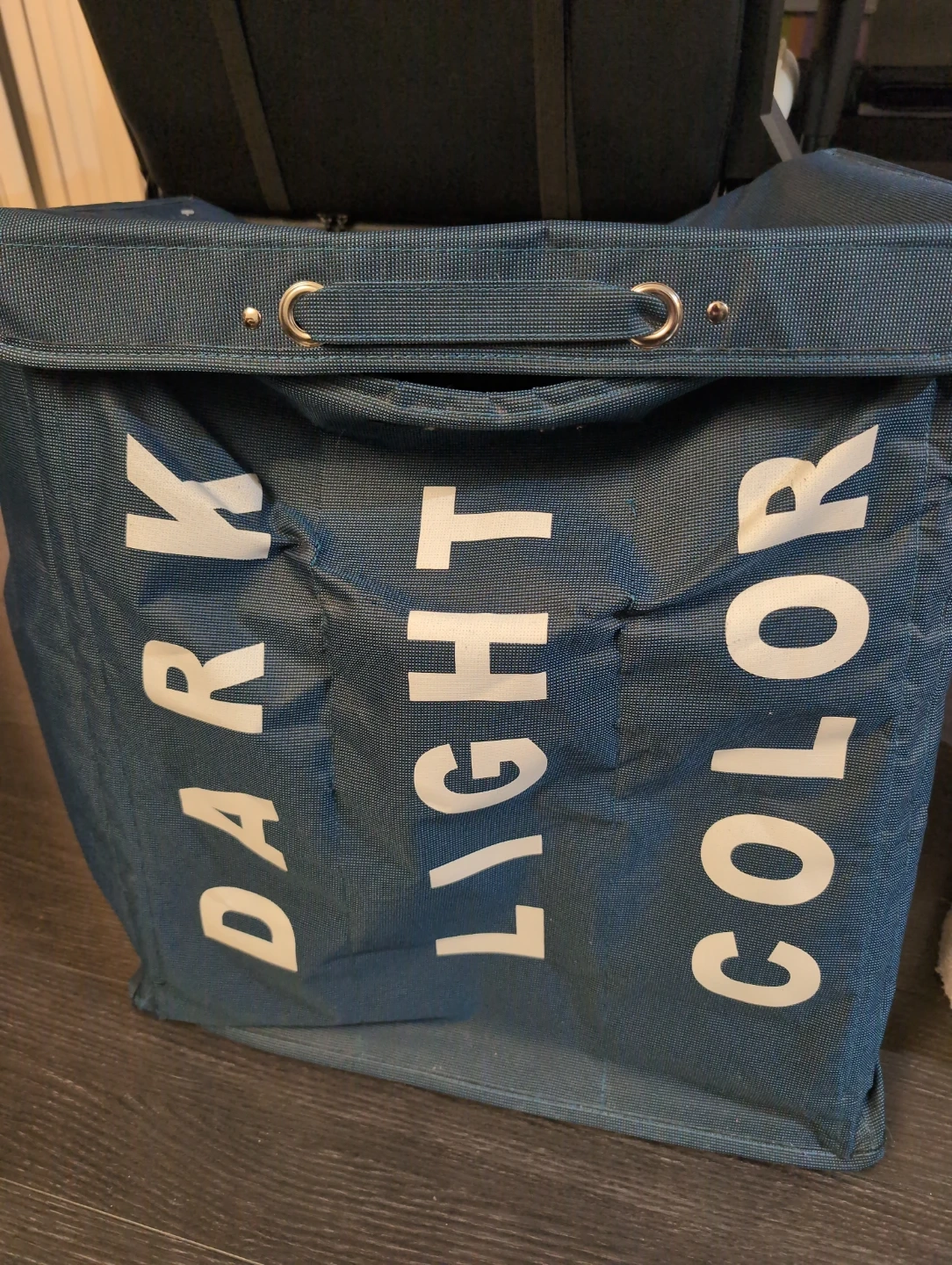 This blue laundry hamper is designed to separate your dark and light colored clothes. It features sturdy handles for easy carrying. Great for organizing laundry day!