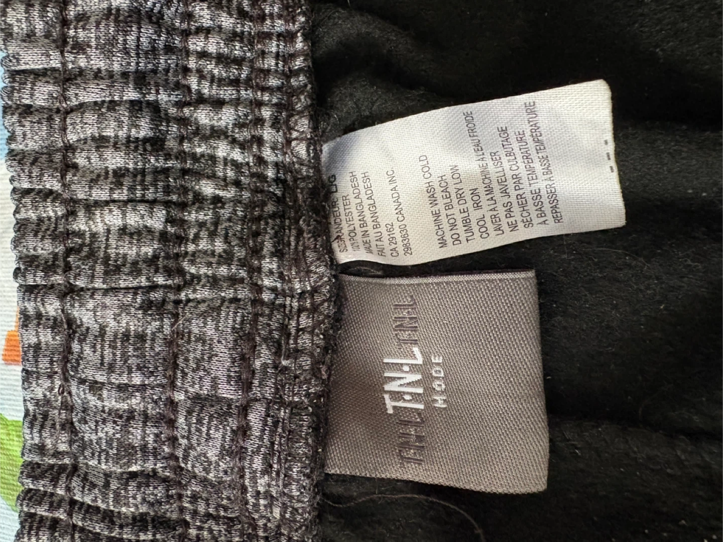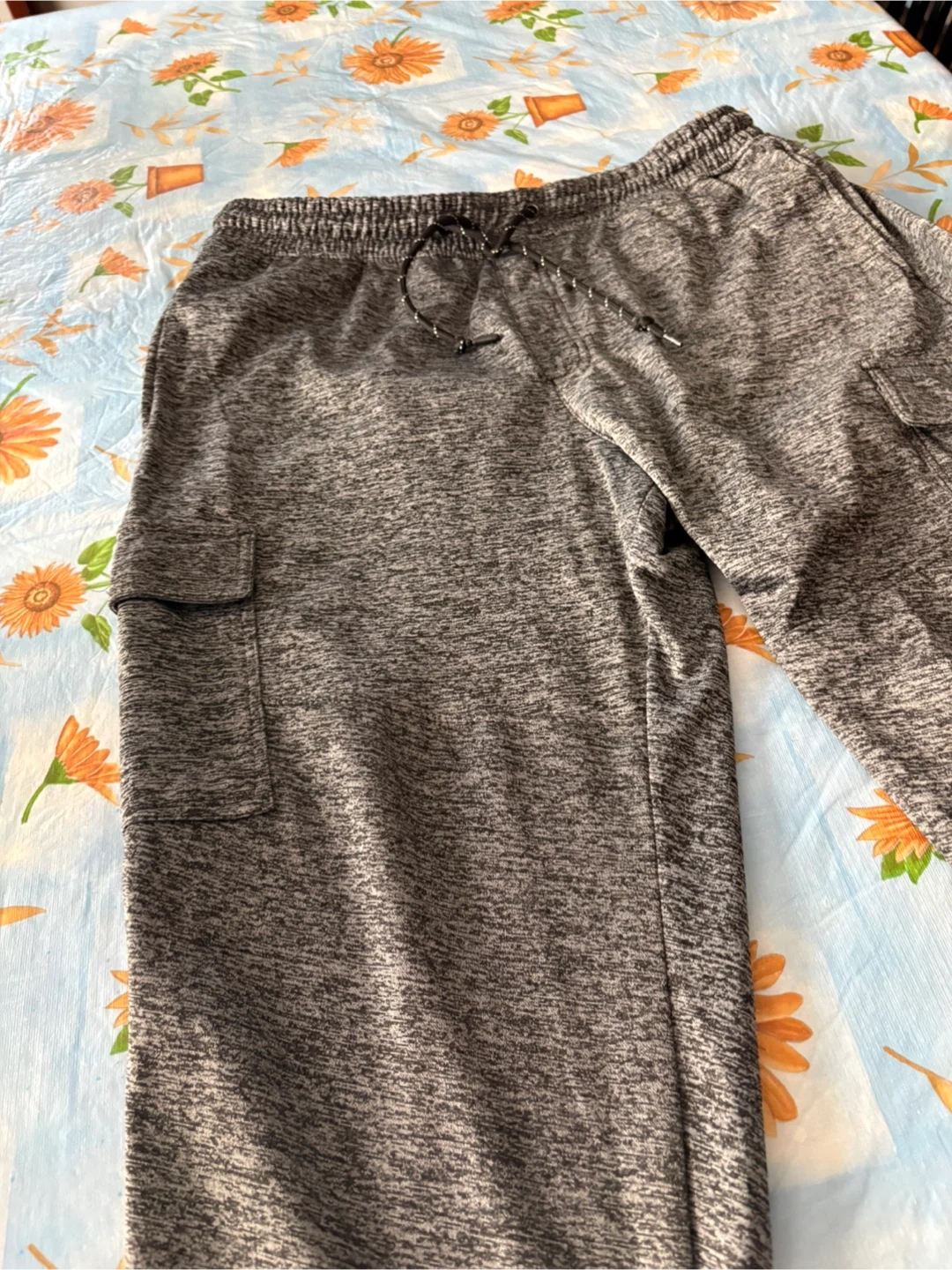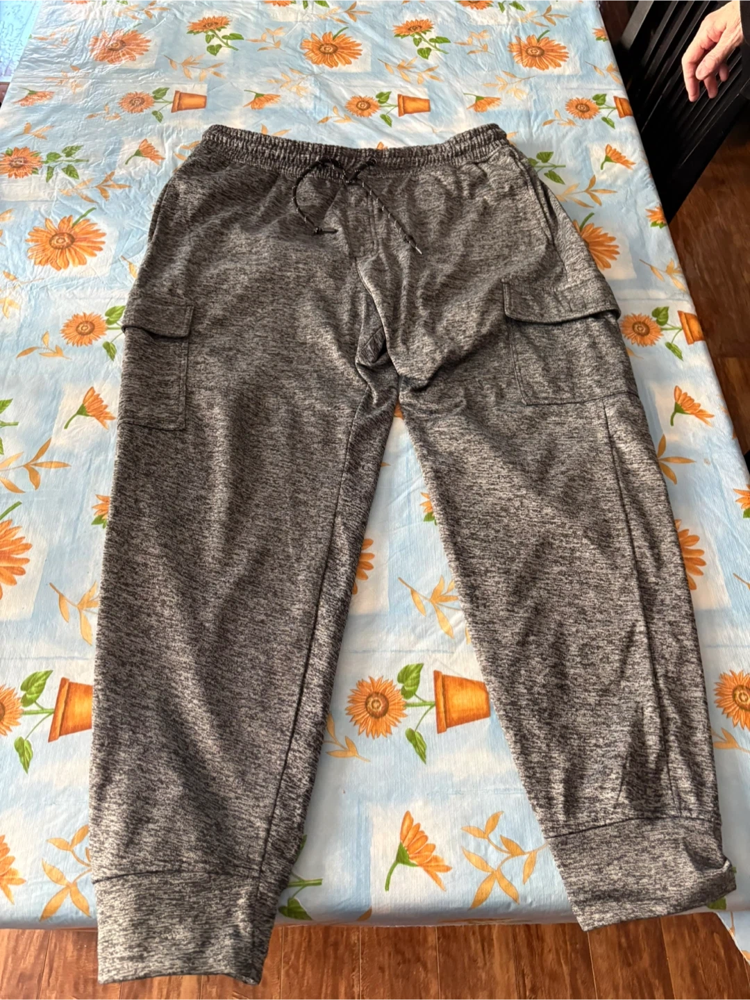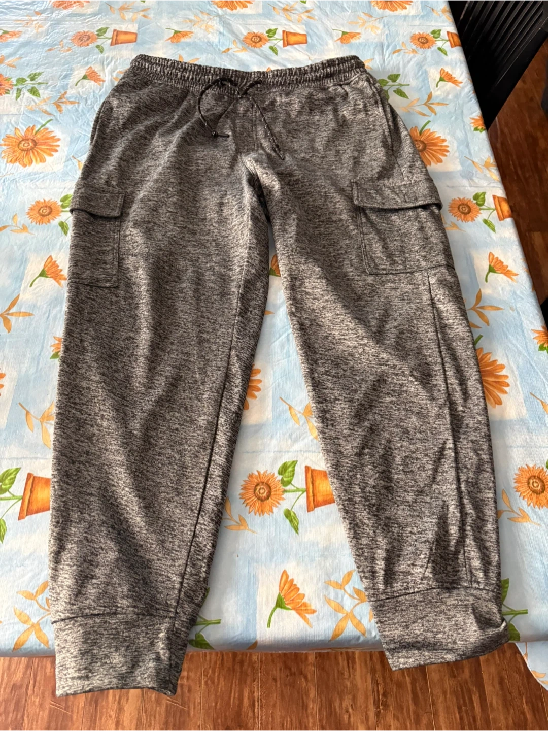 These men's jogger pants are a comfortable grey heather colour. They're made from a polyester and spandex blend for stretch. Features two cargo pockets on the legs. Size Large, like new.