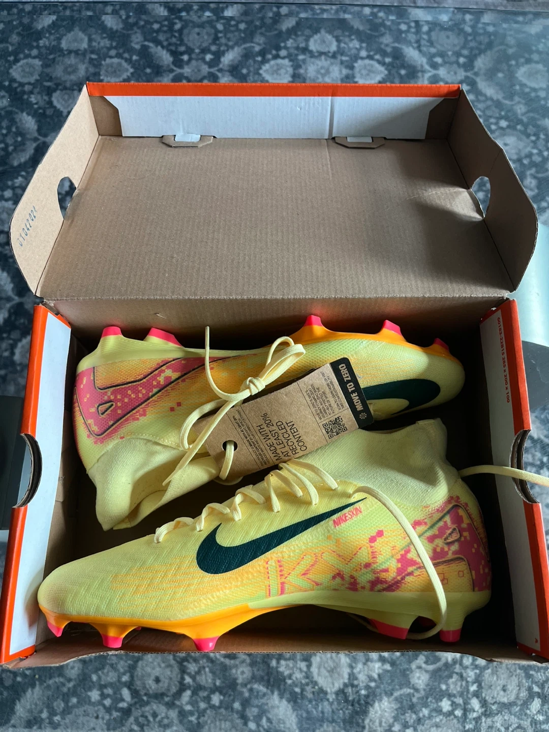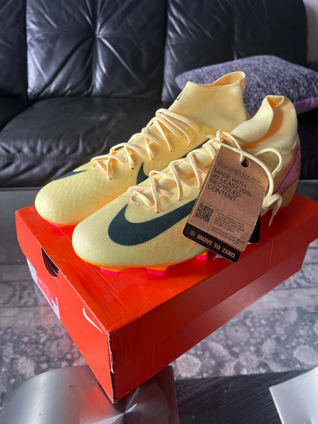These are Nike Mercurial Superfly 10 KM FG/MG soccer cleats in a bright yellow colour. They're made with at least 20% recycled content. The size is a US Men's 9 (UK 8, EU 42.5).