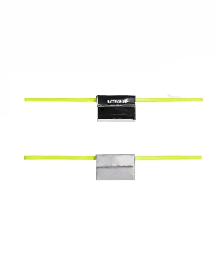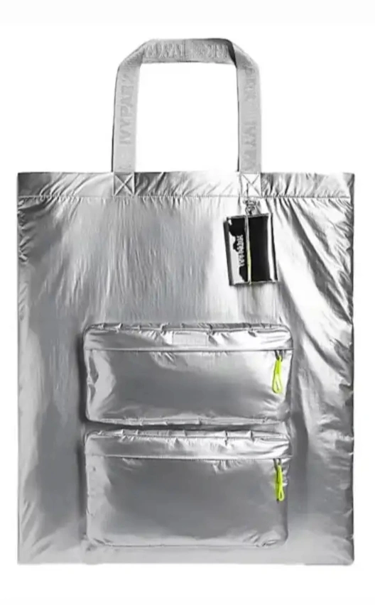 Silver metallic tote bag and matching belt bag. Foldable design. Two zippered pockets on tote. Neon yellow accents. Great for everyday use or travel.