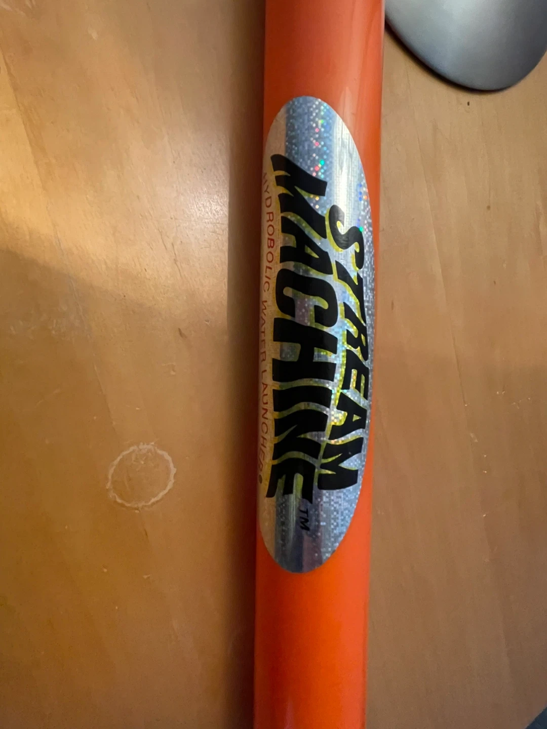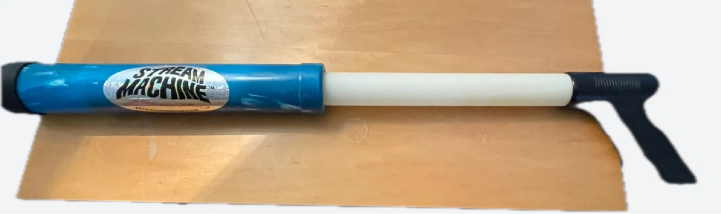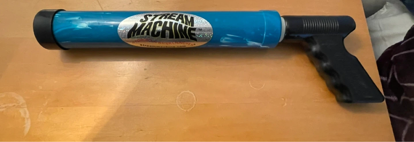 This Stream Machine is a water launcher for outdoor fun. It's orange and blue with a black handle and nozzle. Great for playing in the backyard!