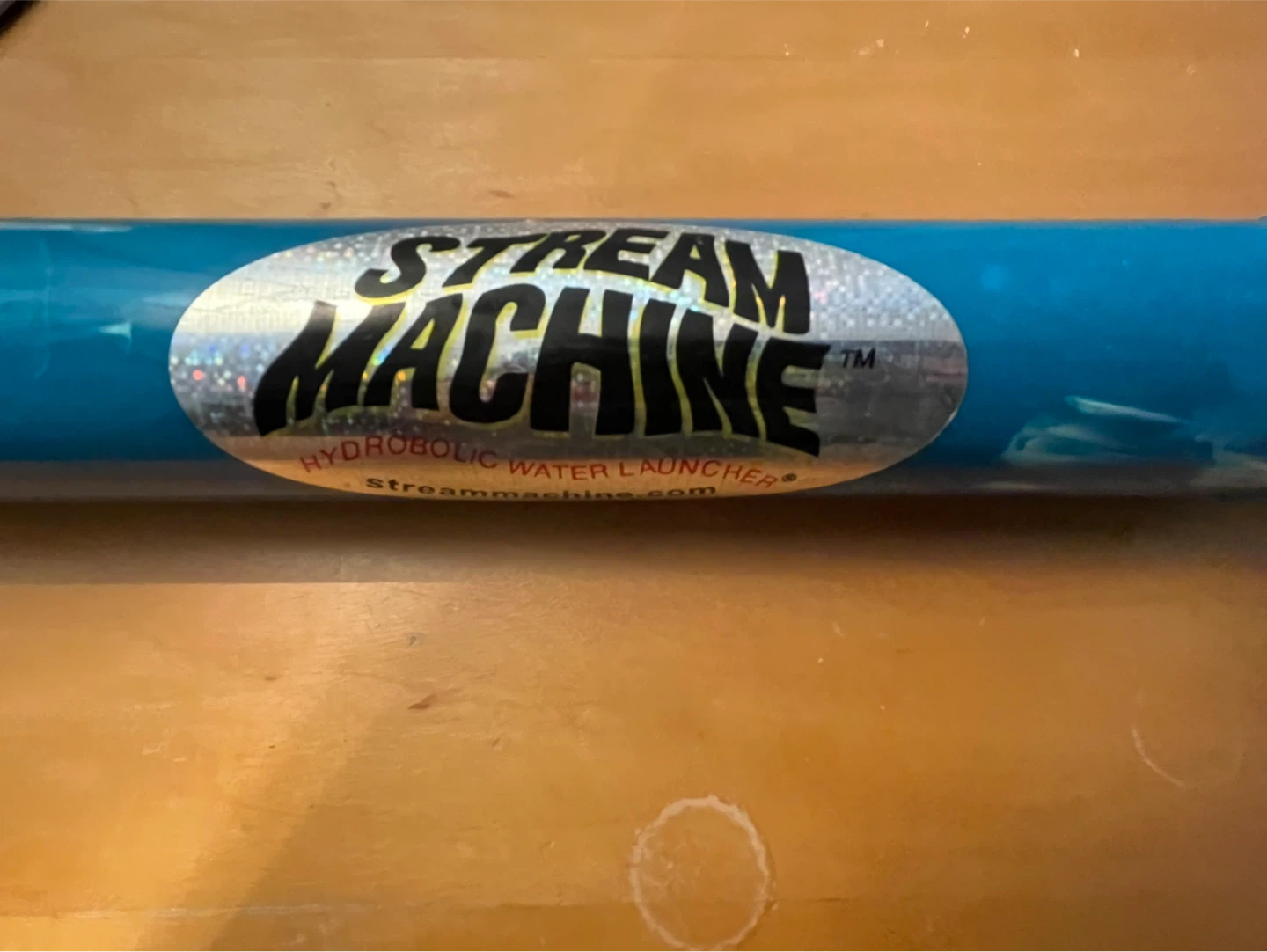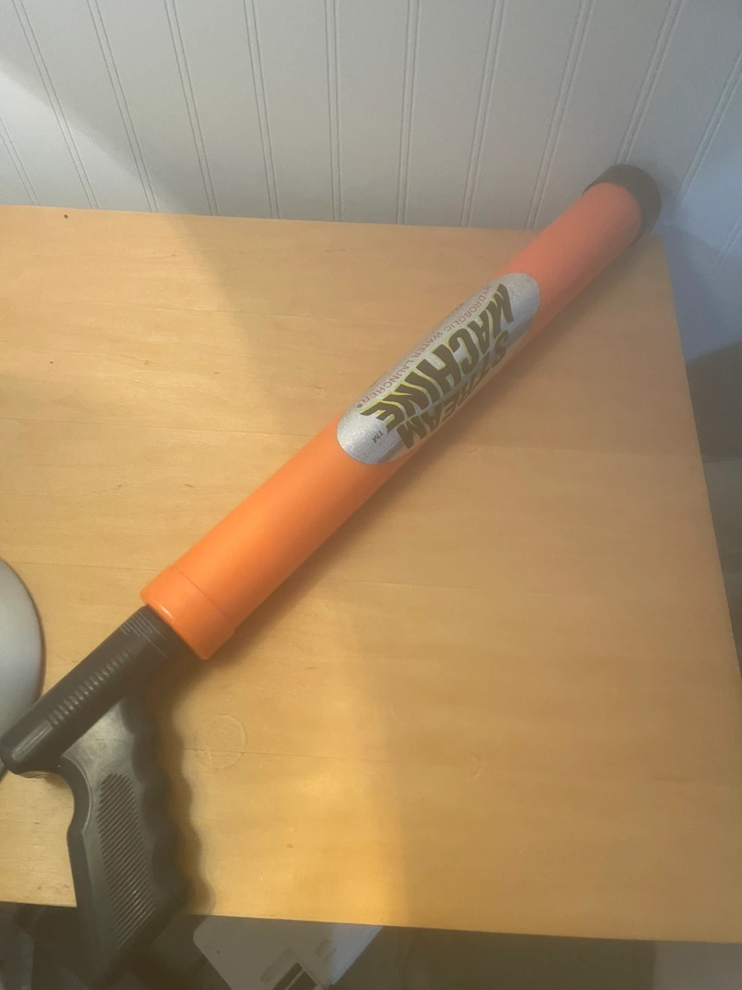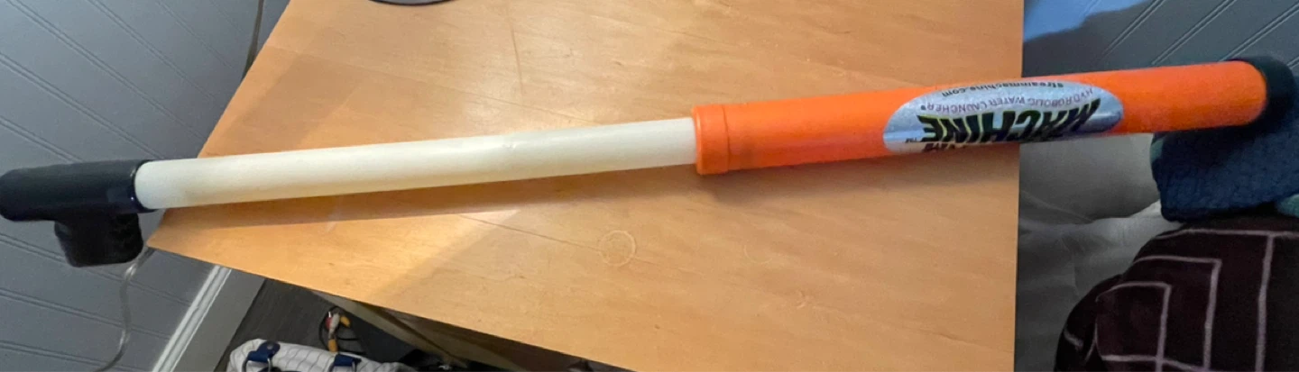 This Stream Machine is a water launcher for outdoor fun. It's orange and blue with a black handle and nozzle. Great for playing in the backyard!