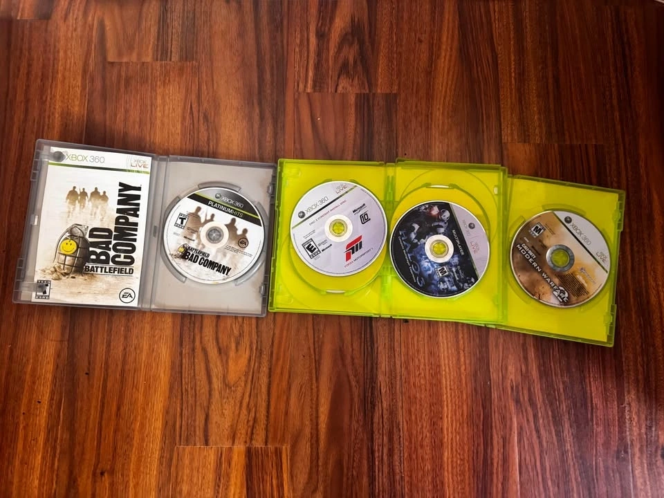 Includes MW2, Battlefield Bad Company, Halo 3 Campaign and Multiplayer, and Forza Motorsport discs 1 and 2. All in good condition.