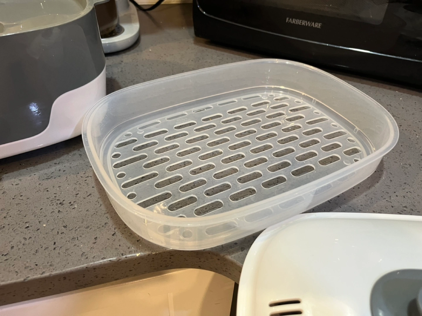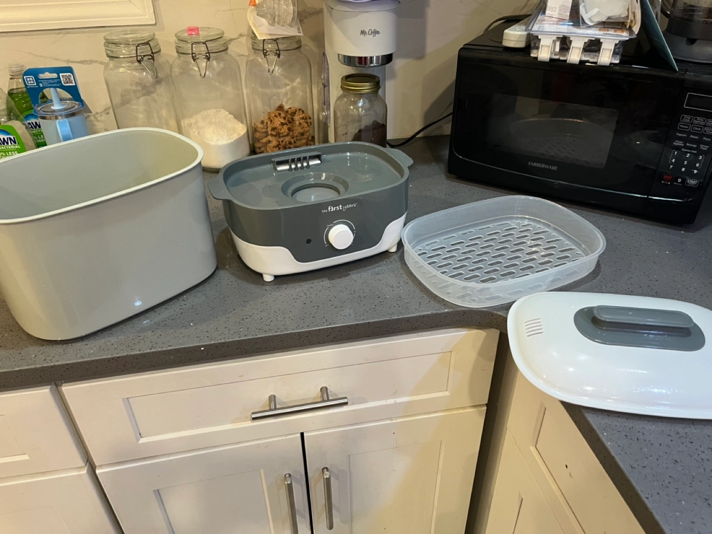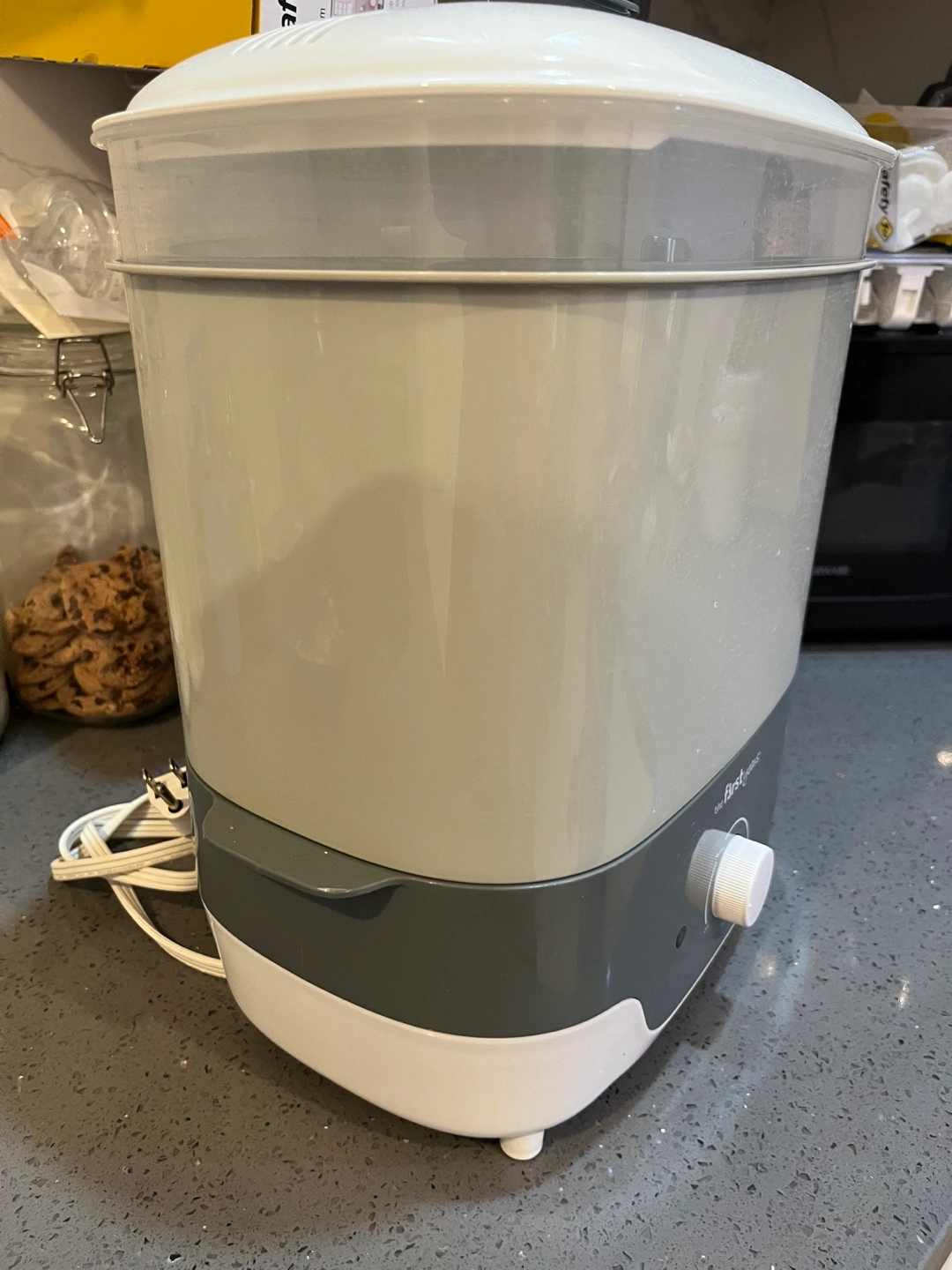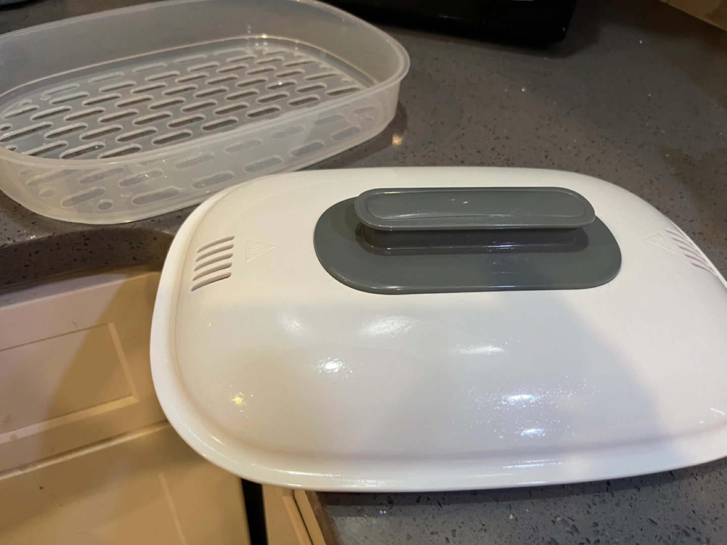 Baby bottle and item sterilizer. Gray and white. Includes removable basin and top rack. Gently used. Purchased in January 2024, retail price $70. Cash only.