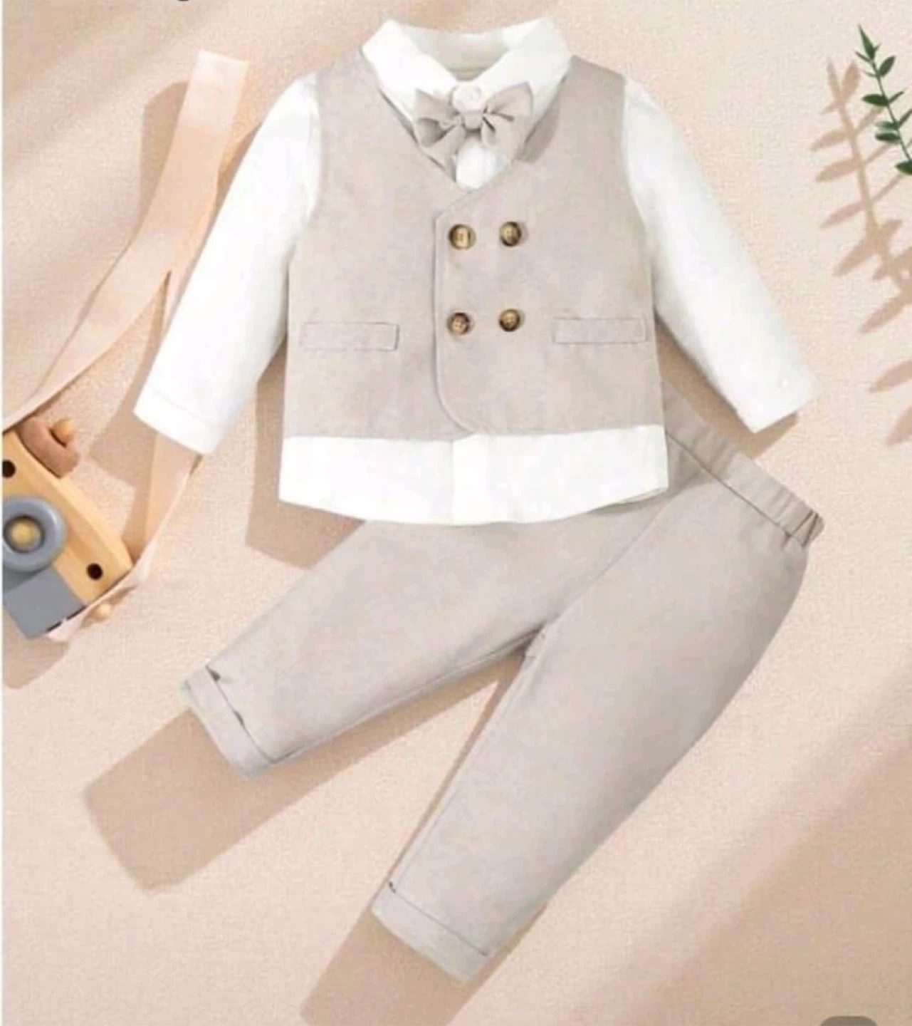 A cute and stylish baby boy outfit from Souflis! This set includes a vest, pants, a shirt and a bow tie. Perfect for a special occasion or just looking extra dapper