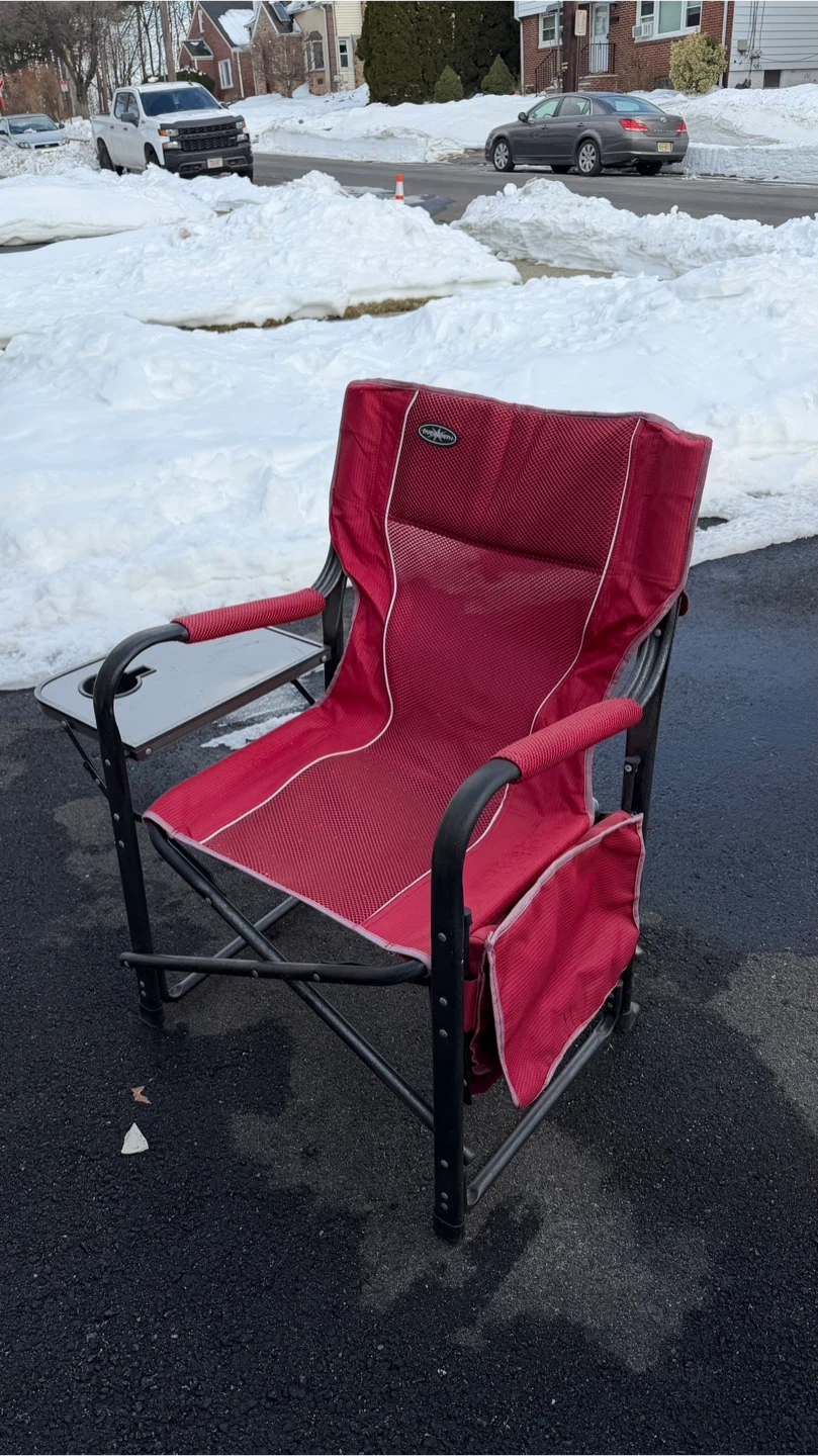 This red folding camp chair has a sturdy metal frame and fabric seat. It features a convenient side table with a cup holder. Great for camping trips or backyard use!