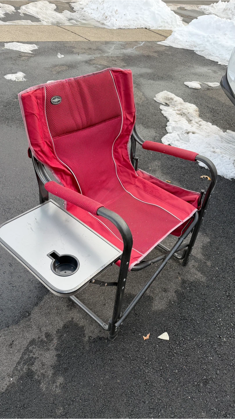 This red folding camp chair has a sturdy metal frame and fabric seat. It features a convenient side table with a cup holder. Great for camping trips or backyard use!