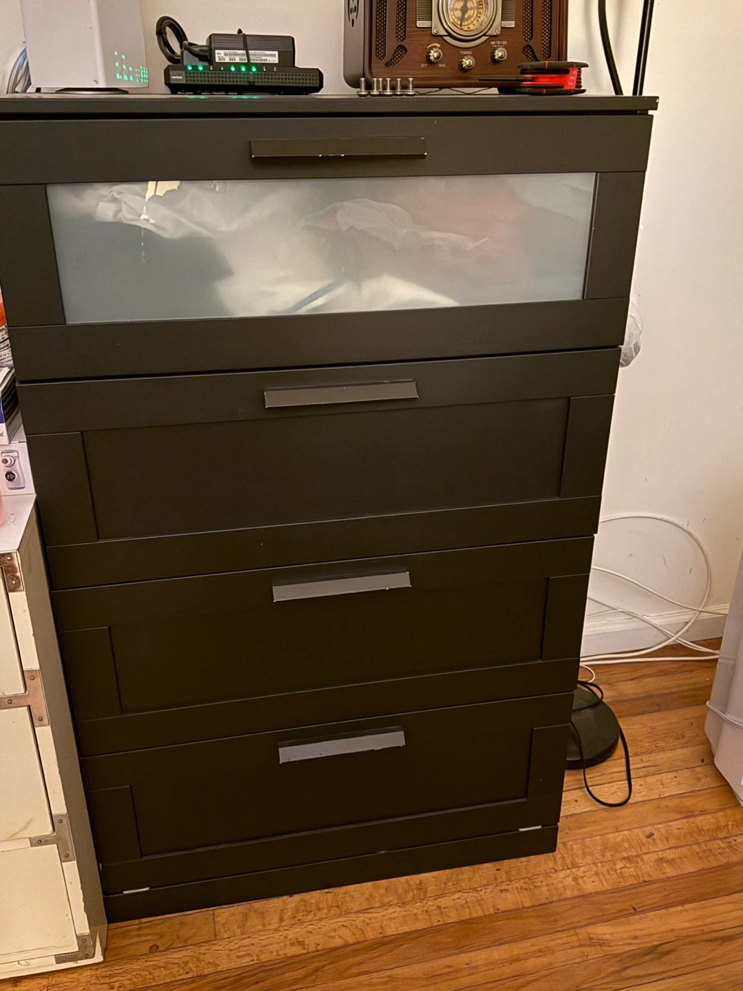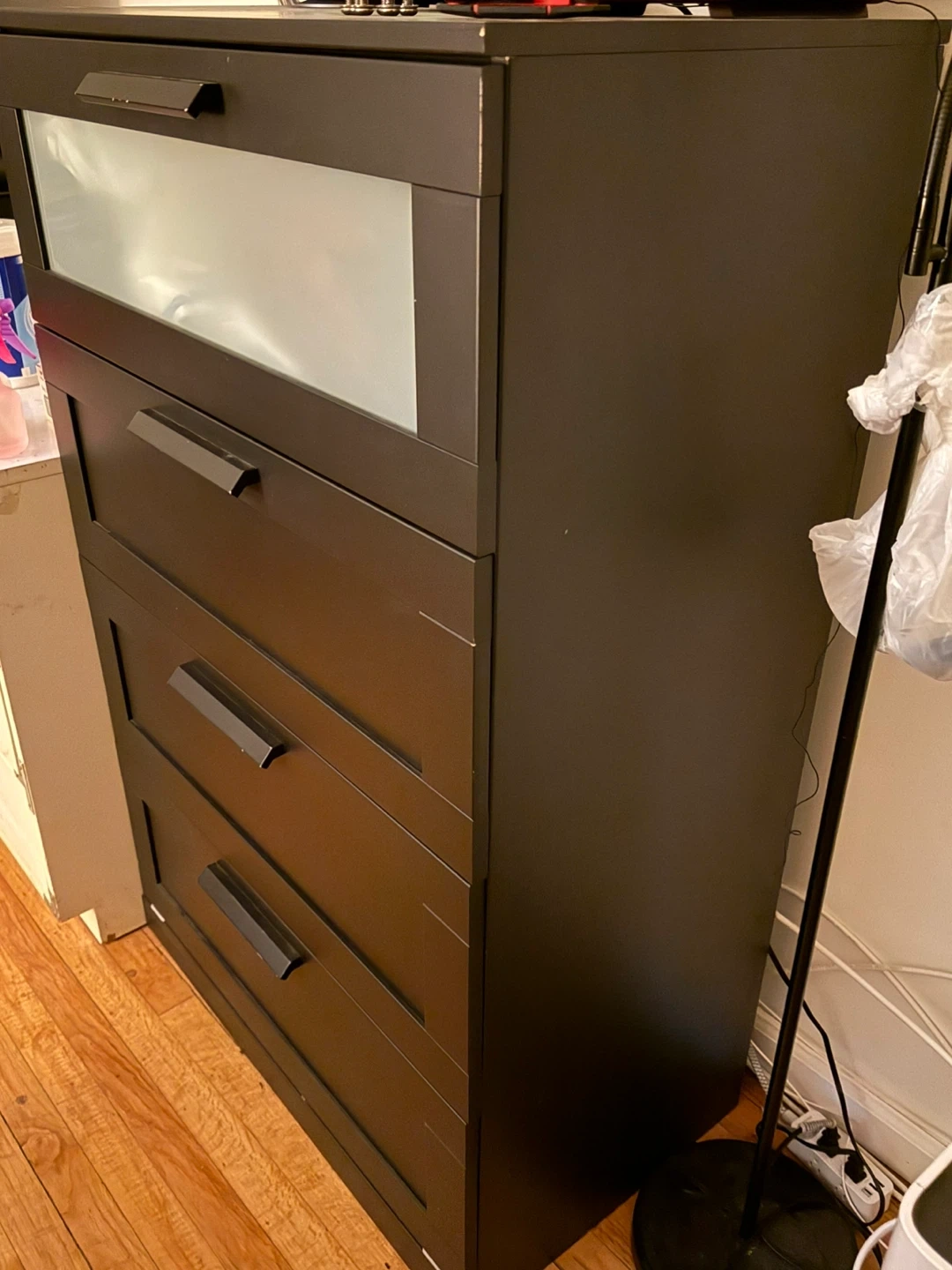 This dresser features a dark brown finish and a frosted glass insert at the top. It has five drawers for storage, each with a sleek metal handle. This dresser is great for bedrooms or living spaces needing extra storage.