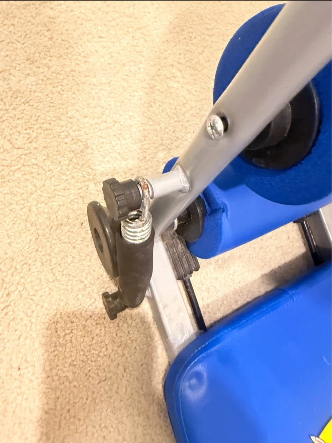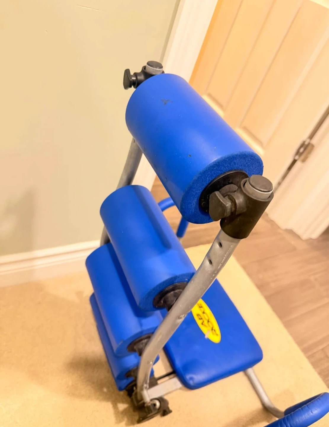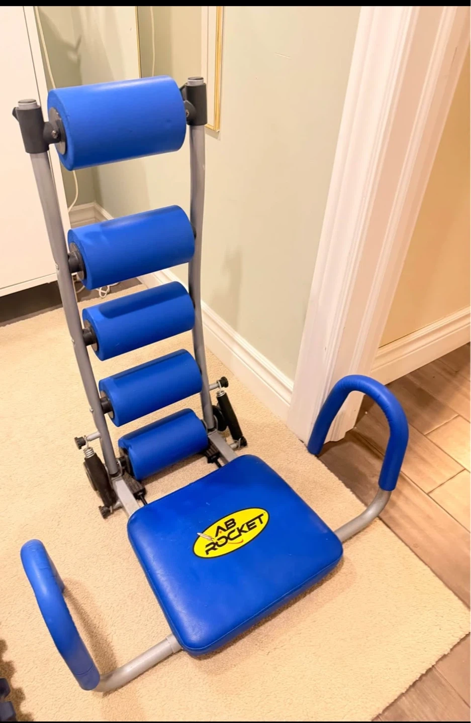 This is an Ab Rocket exercise machine in blue and grey. It features padded rollers for comfort. Great for core workouts at home!