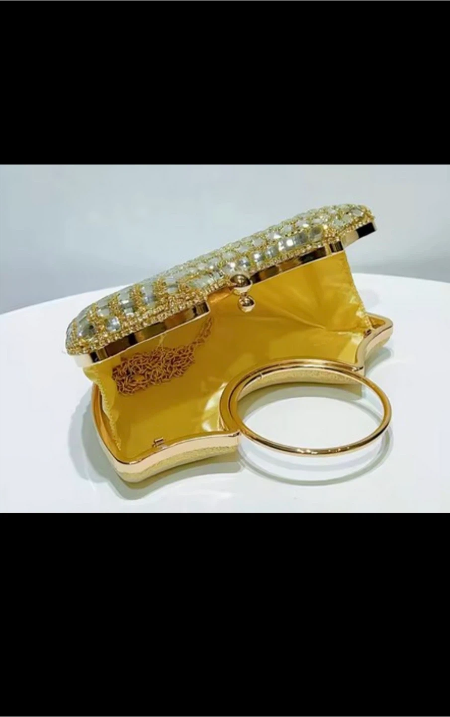 Sparkly fan-shaped clutch purse covered in rhinestones and crystal accents. Features a gold-tone ring handle and a golden satin-lined interior. It's perfect for evening events or adding glamour to any outfit!