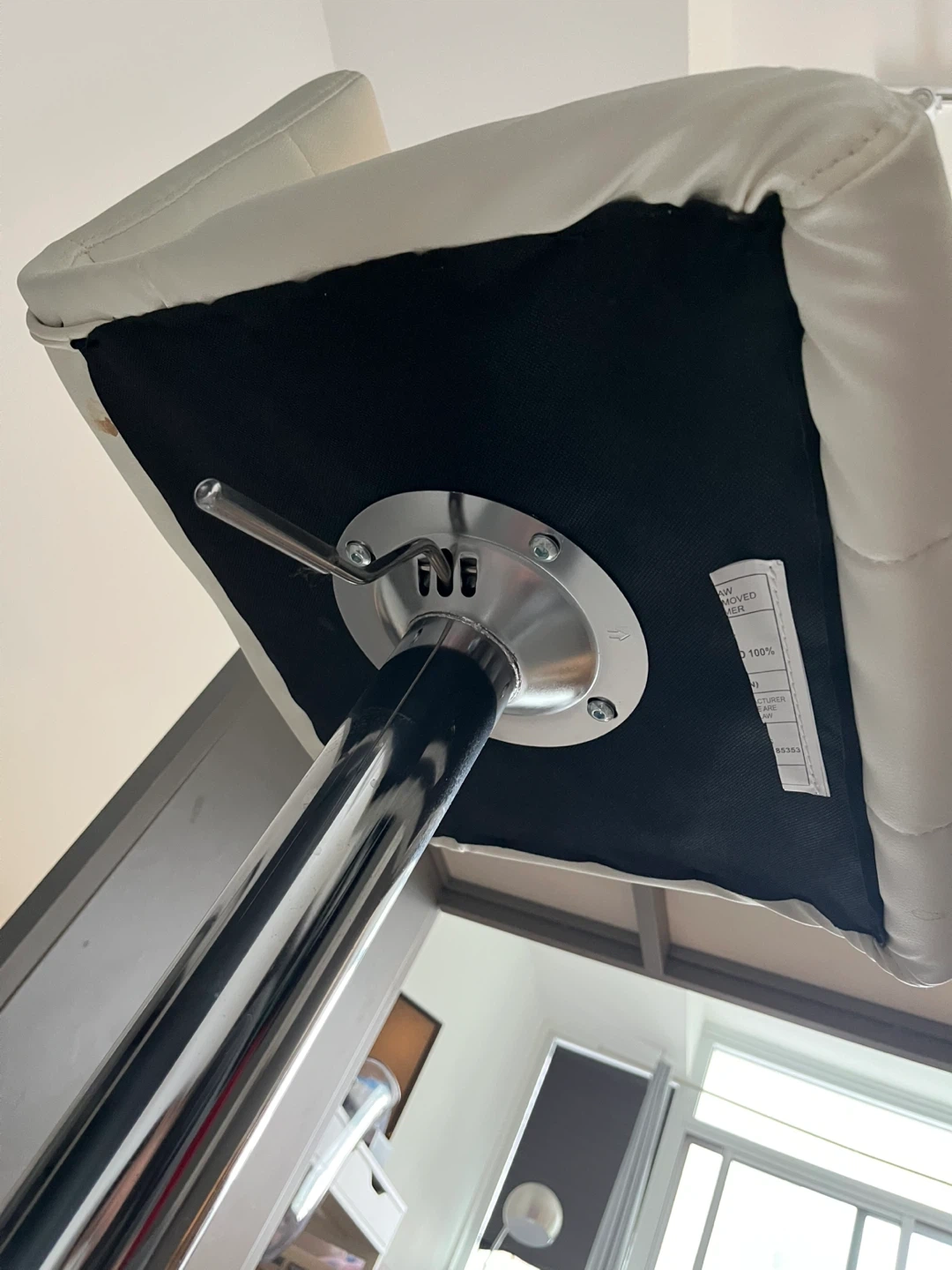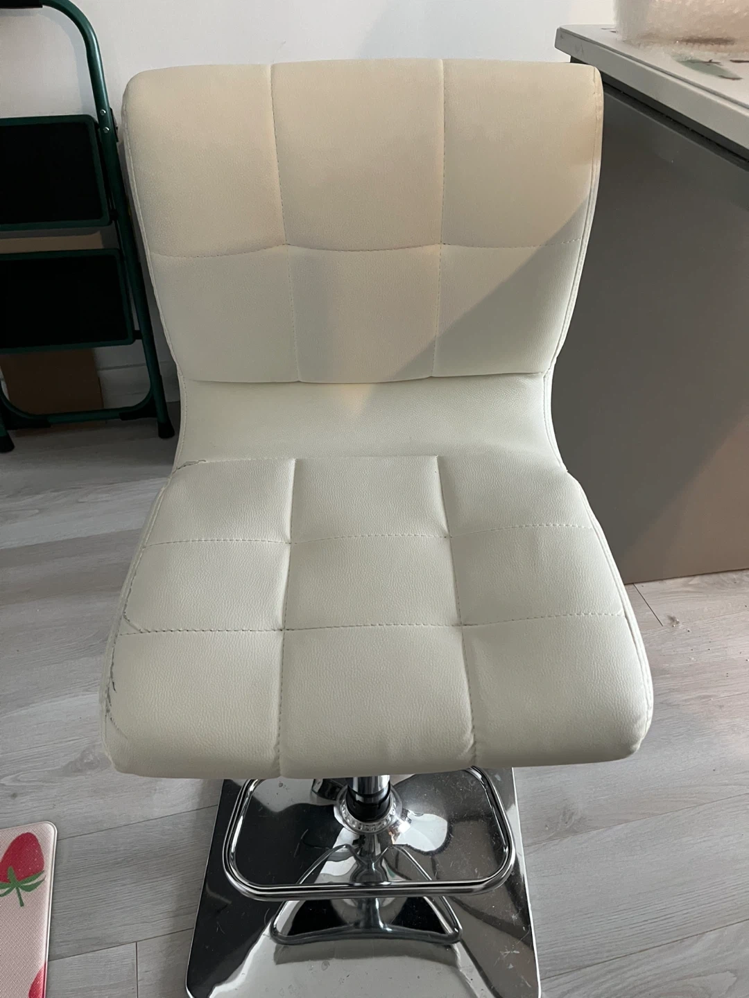Two white faux leather bar stools with square chrome bases. They’re adjustable in height!