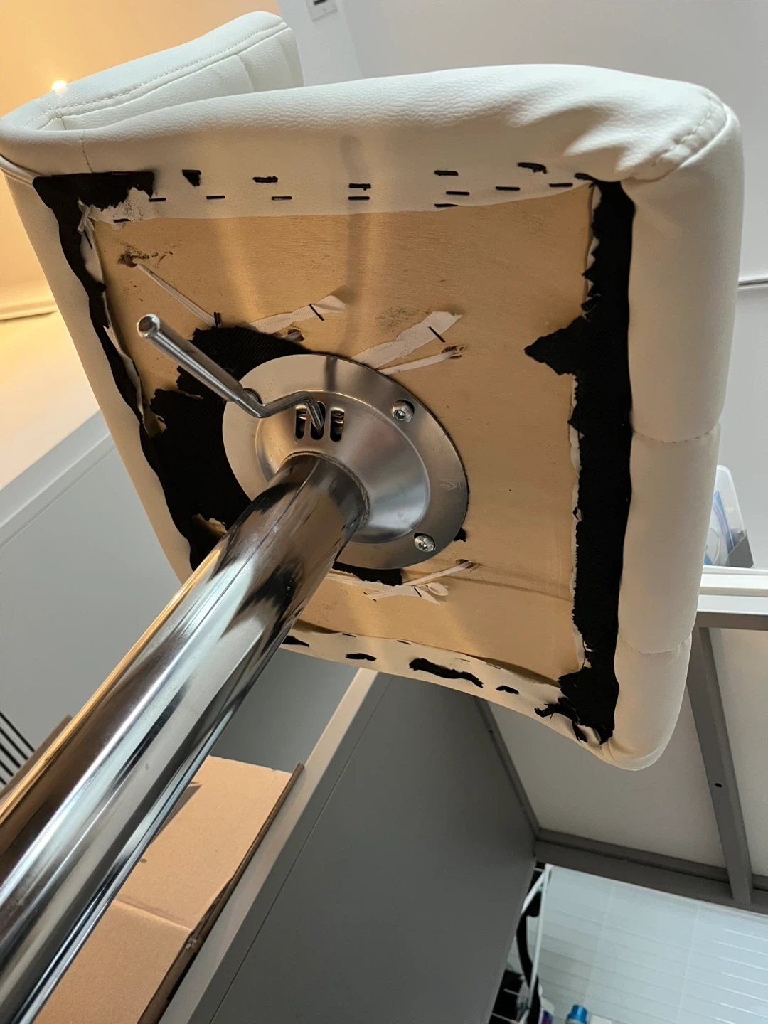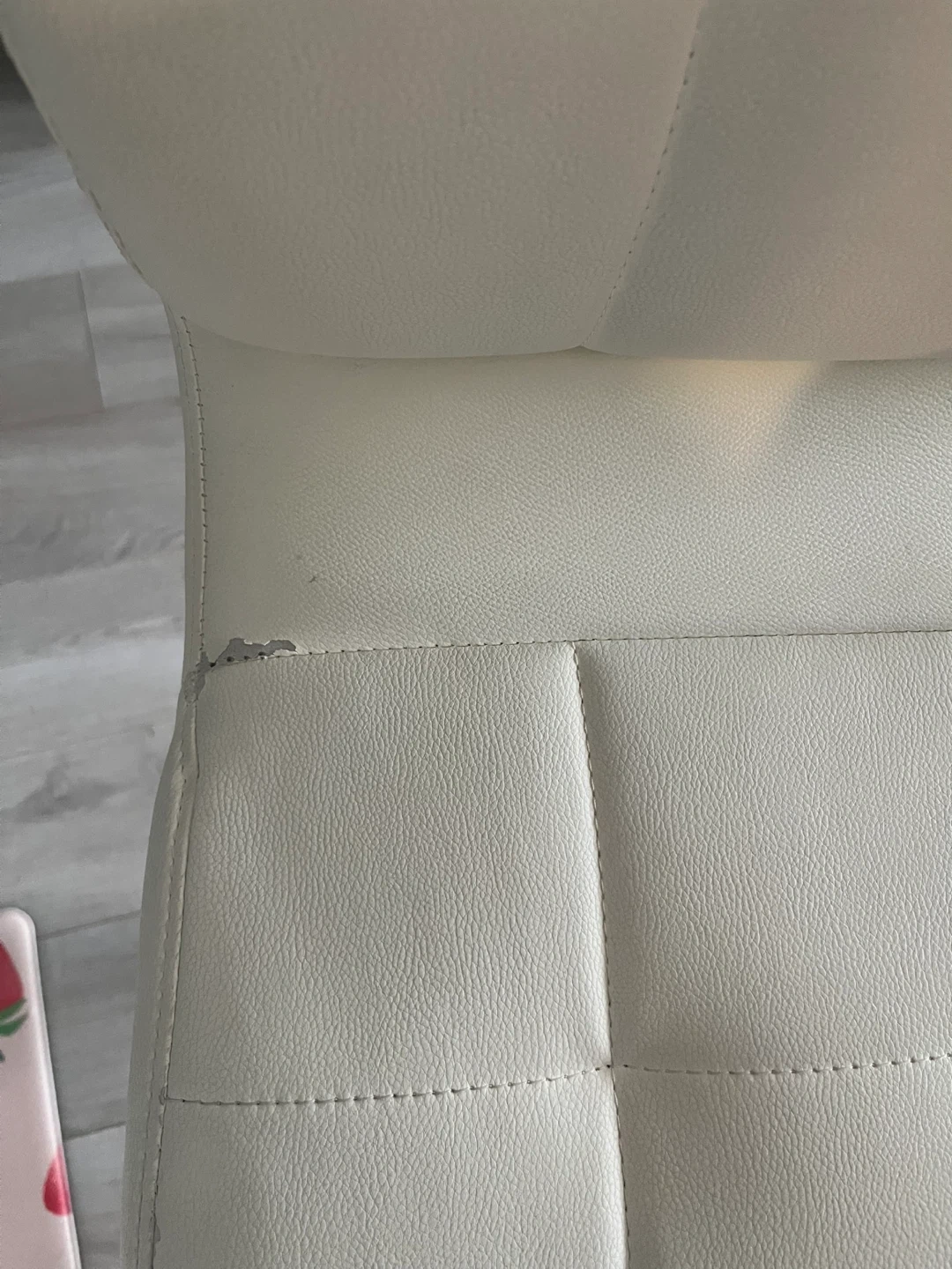 The underside of the first chair has some torn fabric that is not visible. The second chair has minor damage on the top of the seat.