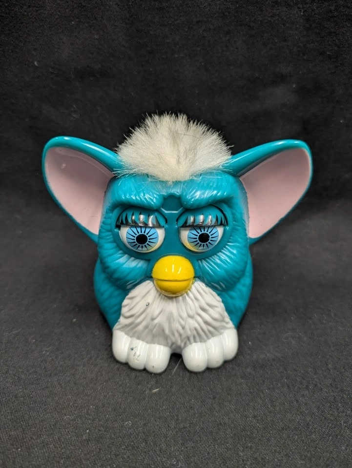 1998 - Turquoise Furby - fluttering eyes & purrs - 3" tall - slight wear on front.