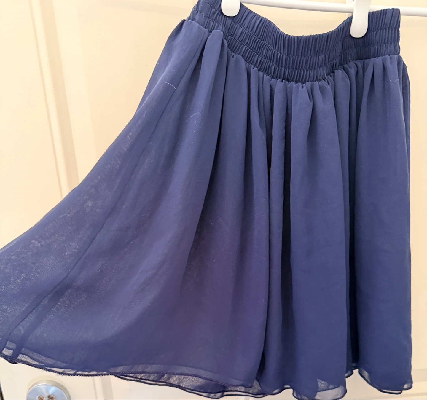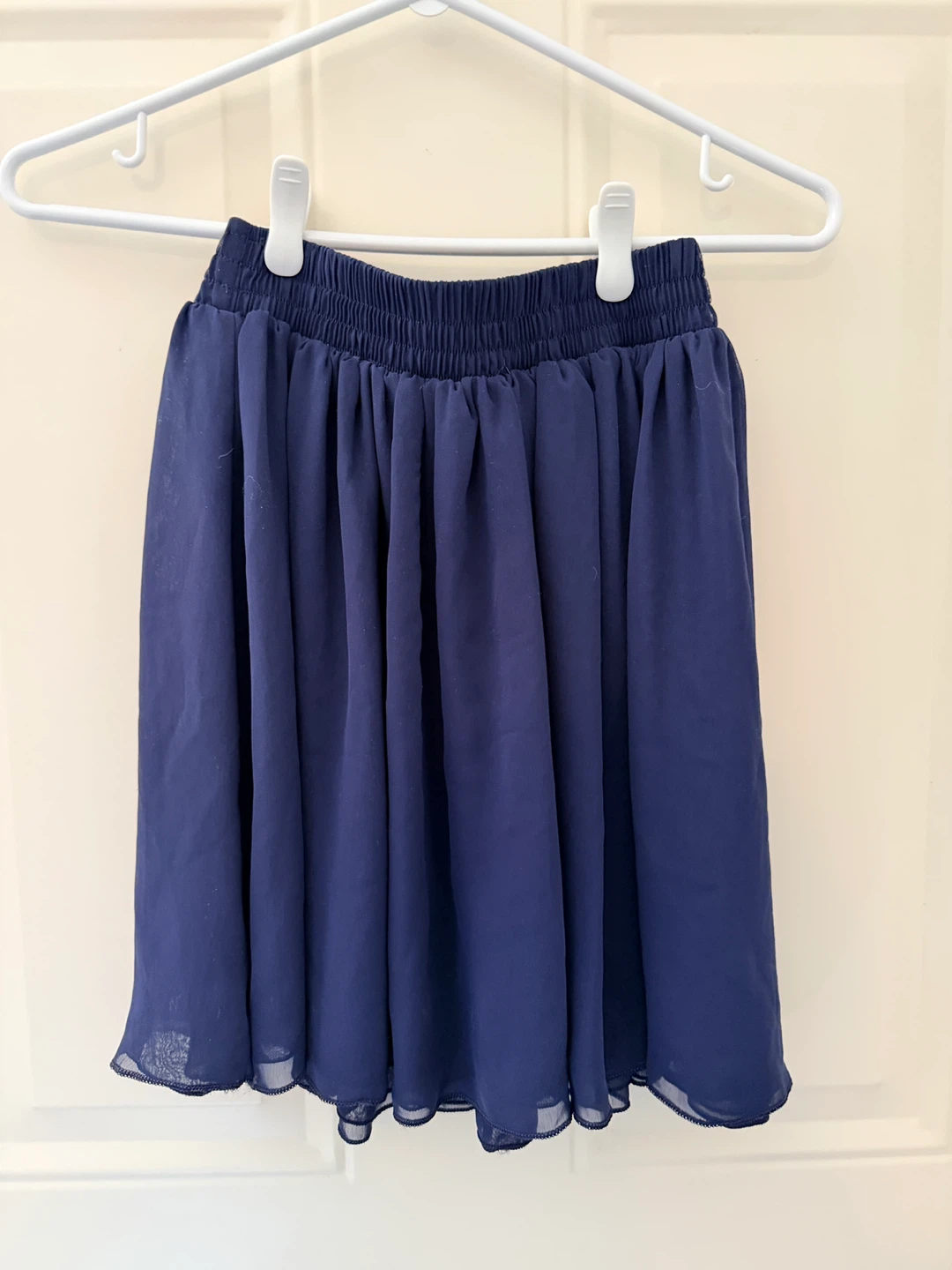 A flowy navy blue chiffon skirt with an elastic waistband.