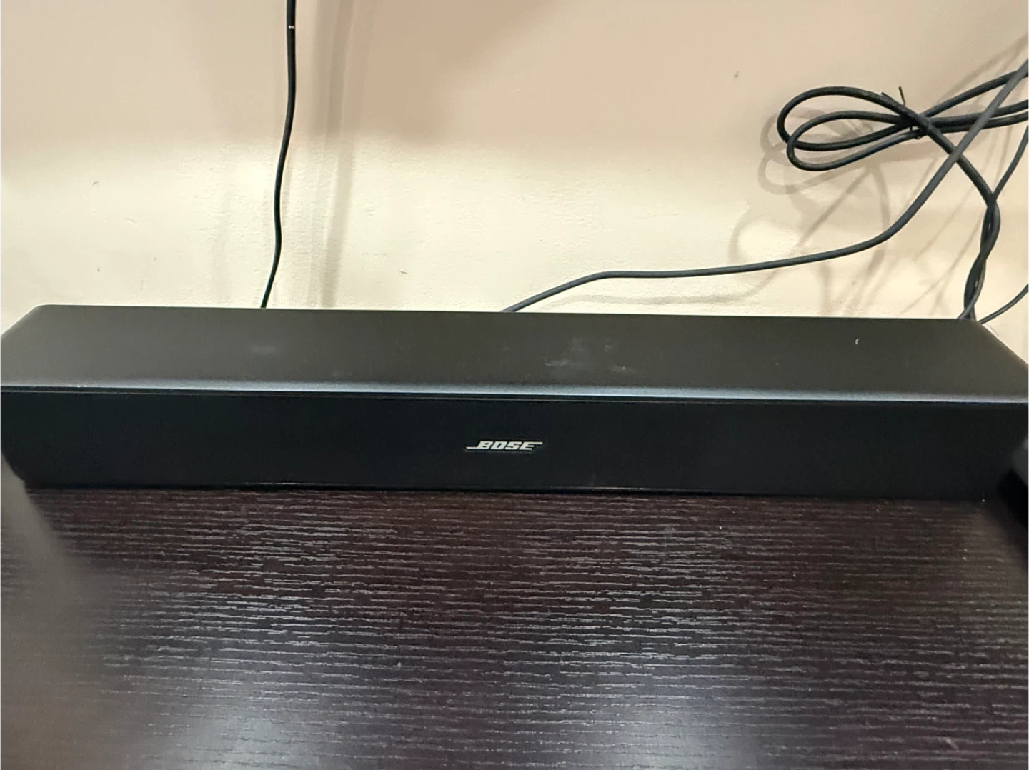 This is a black Bose soundbar. It's a compact audio device for your entertainment system. Its sleek design fits well with most TV setups.