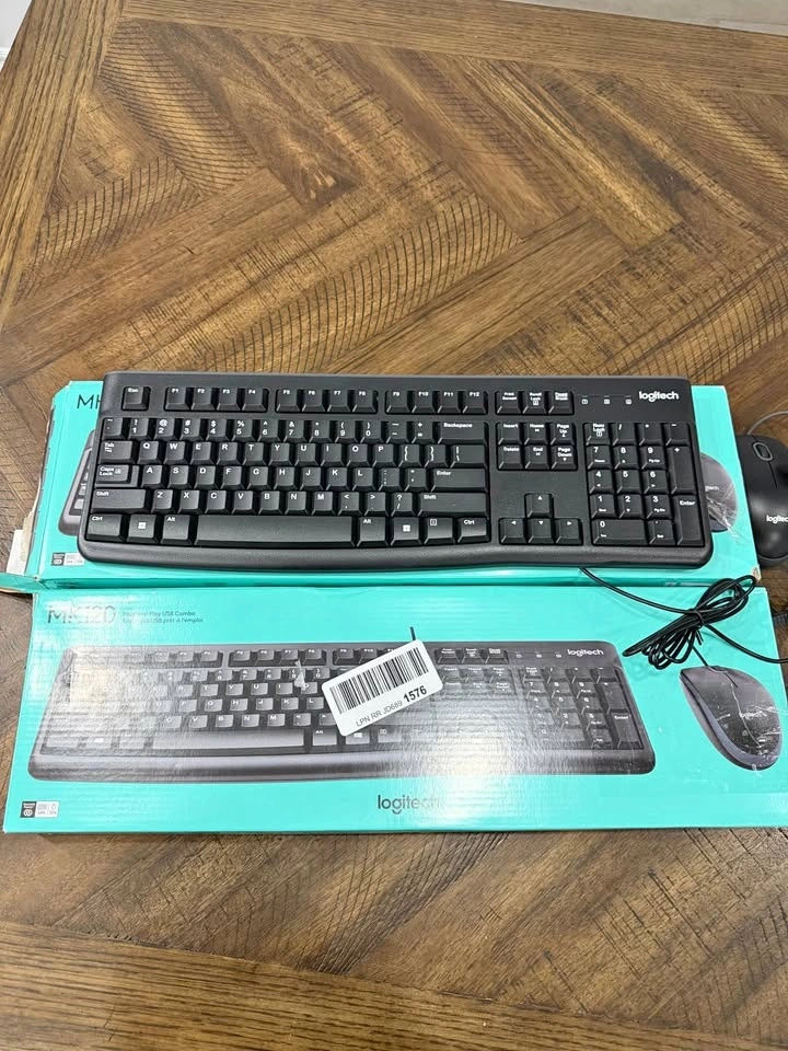 Two complete Logitech MK120 keyboard and mouse combos available. Each set includes a wired USB keyboard and a wired USB mouse. Simple plug and play setup.