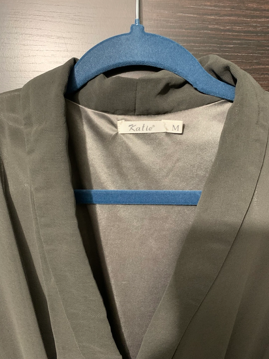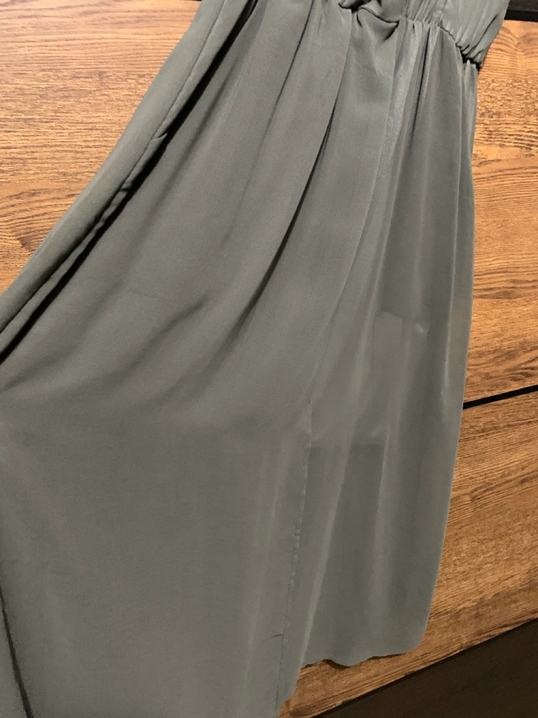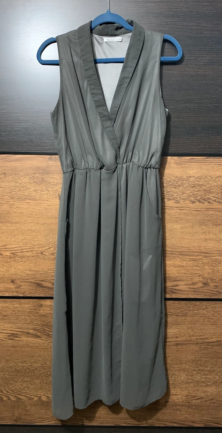 Elegant sleeveless midi dress. Semi-transparent, knee-length lining. Grey colour. Features a V-neckline and empire waist. Side slit. Size Medium.