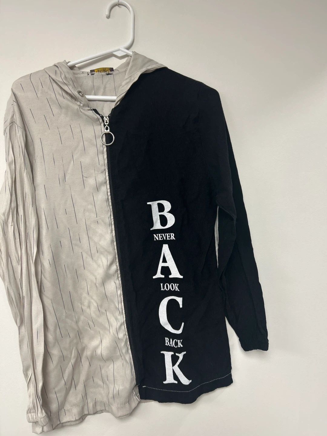 This stylish hoodie features a unique two-tone design with vertical pinstripes on one side and a bold "Never Look Back" graphic on the other. It's a full-zip hooded jacket with a metal ring zipper pull. Made with a lightweight fabric, it's suitable for layering. Great for adding a statement piece to your casual wardrobe!